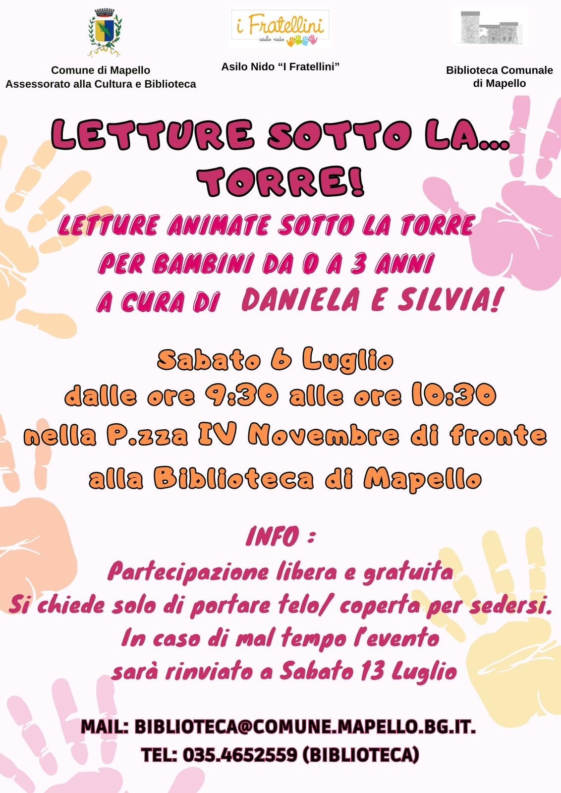 Sabato 6 luglio a Mapello sono in programma le letture animate sotto la Torre per bambini da 0 a 3 anni a cura di Daniela e Silvia.