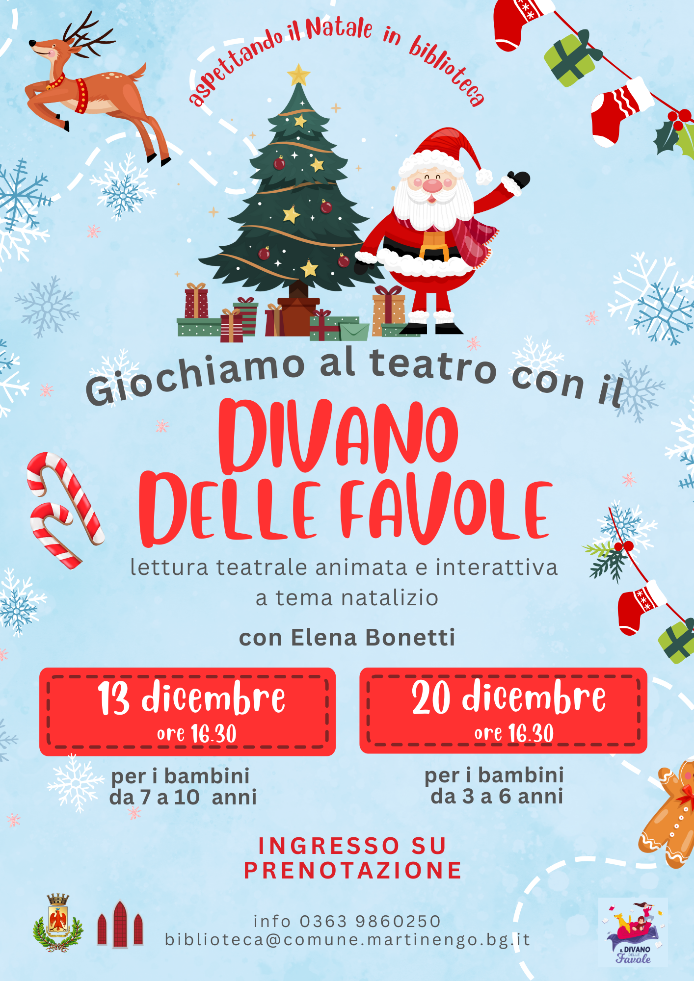 Mercoledì 13 dicembre ore 16.30, per i bambini 7-10 anni: Giochiamo al teatro con il Divano delle favole. Lettura teatrale animata a tema natalizio con Elena Bonetti (Ingresso su prenotazione)