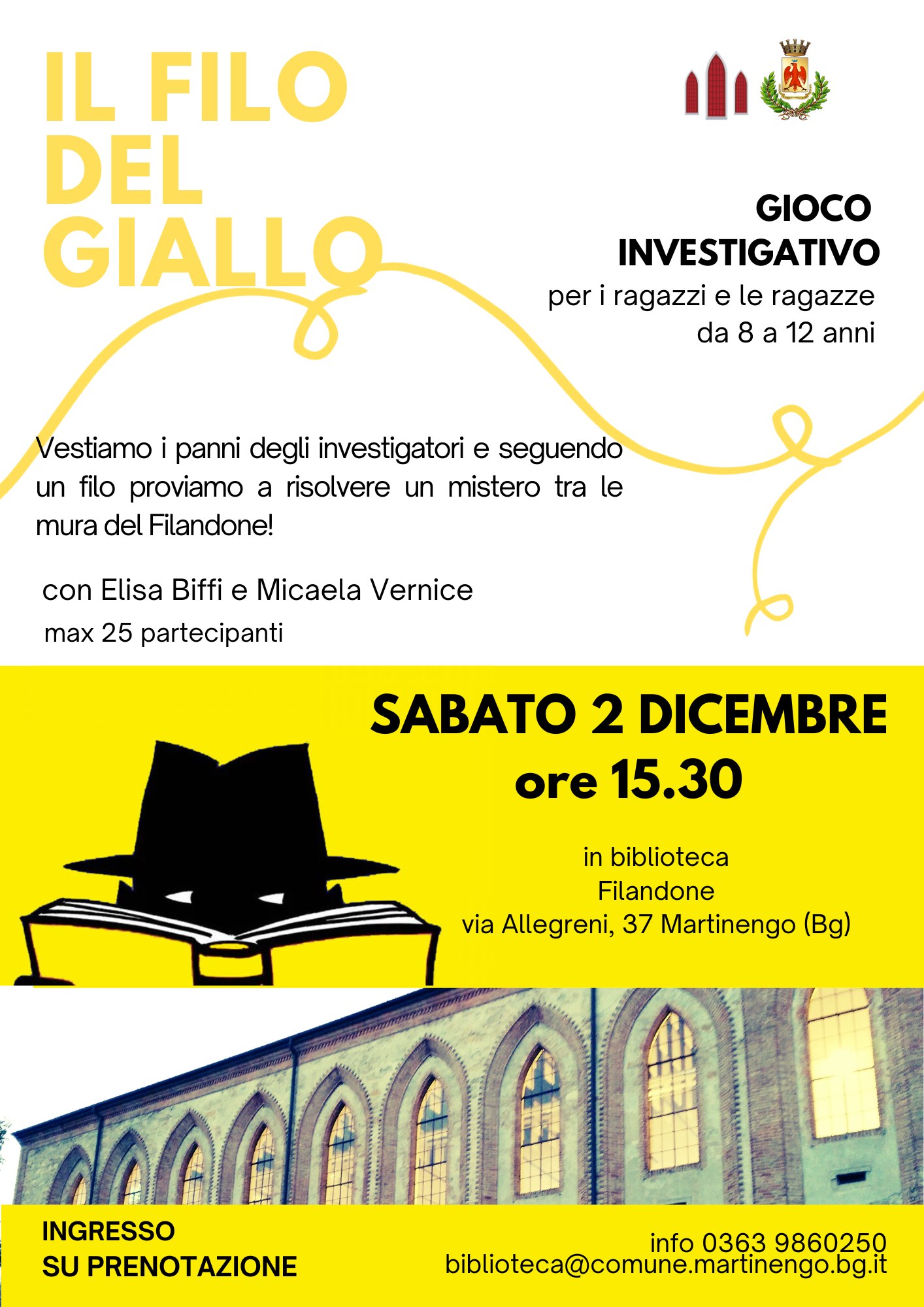 Sabato 2 dicembre dalle ore 15.30 in biblioteca si terrà il gioco investigativo "Il Filo del giallo": vestiamo i panni degli investigatori e seguendo un filo proviamo a risolvere un mistero tra le mura del Filandone!