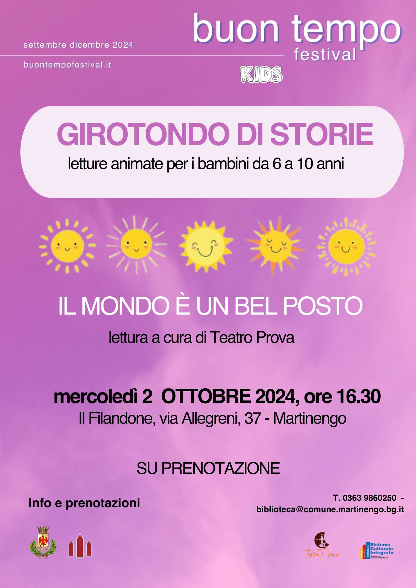 Il Festival di lettura e dintorni "buon tempo, libri per piacere" è una rassegna organizzata dal Sistema bibliotecario della bassa pianura bergamasca che vuole accompagnarvi in un mondo fatto di storie, racconti, letture, visite guidate, incontri con gli scrittori. La sezione "Girotondo di storie" propone coinvolgenti letture animate a cura di compagnie teatrali per bambini dai 6 ai 10 anni. Un’occasione unica per vivere avventure emozionanti, sviluppando la fantasia e l'amore per la lettura. Un mondo di storie per i piccoli grandi sognatori.