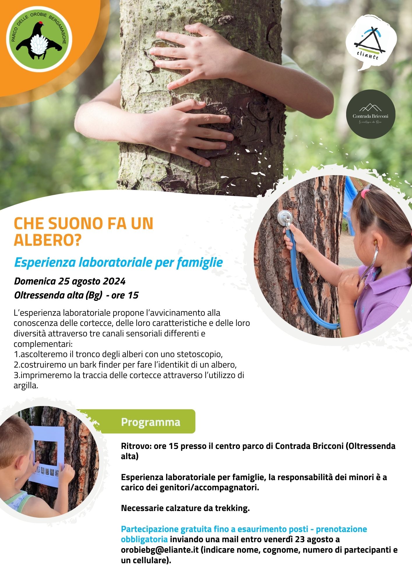 Interessante esperienza laboratoriale per famiglie che propone l’avvicinamento alla conoscenza delle cortecce, delle loro caratteristiche e delle loro diversità attraverso tre canali sensoriali differenti e complementari: ascolteremo il tronco degli alberi con uno stetoscopio, costruiremo un bark finder per fare l’identikit di un albero, imprimeremo la traccia delle cortecce attraverso l’utilizzo di argilla.