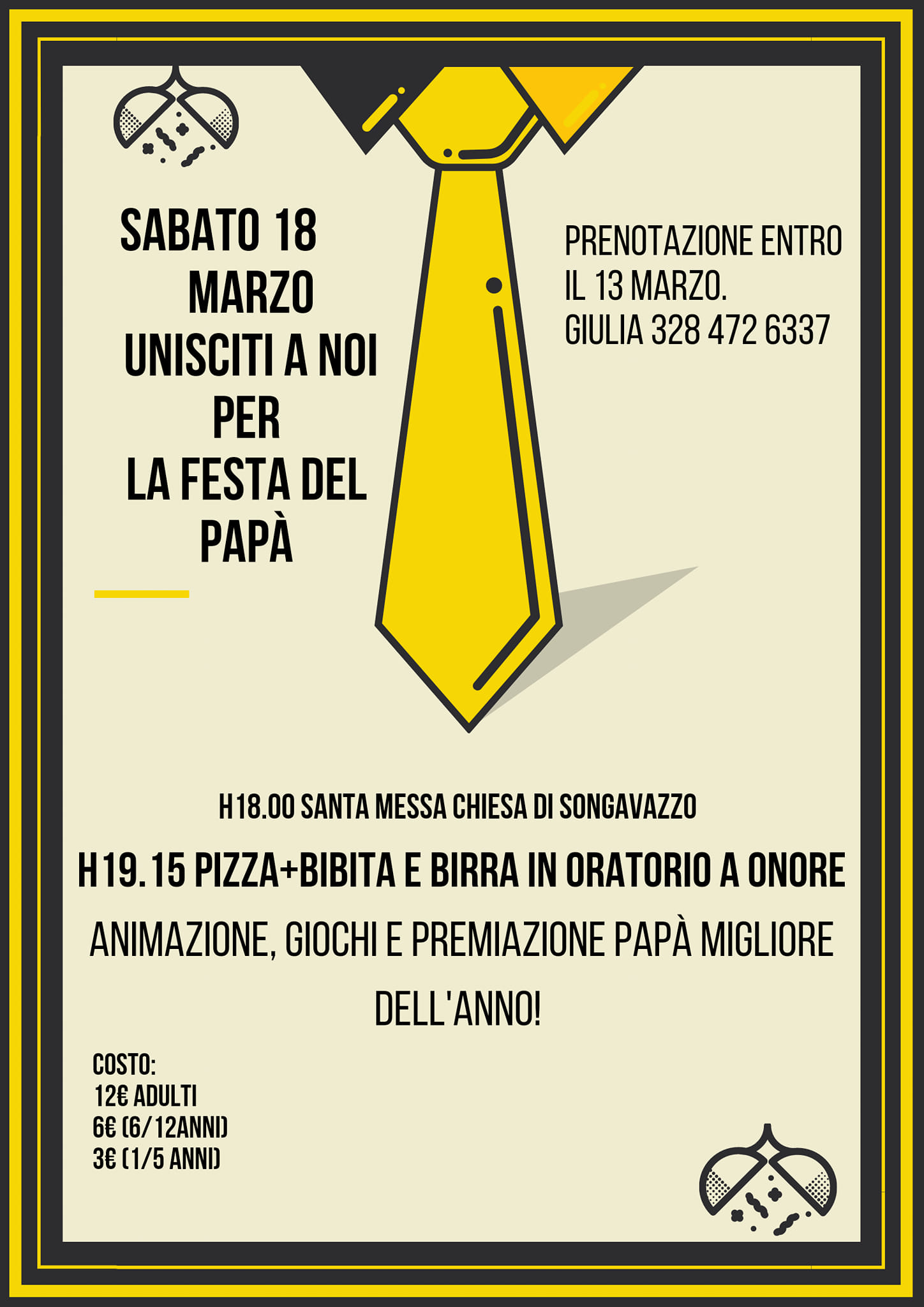 All' Oratorio Ad Onore si terrà una festa ricca di animazione , giochi e premiazione del papà migliore dell'anno.