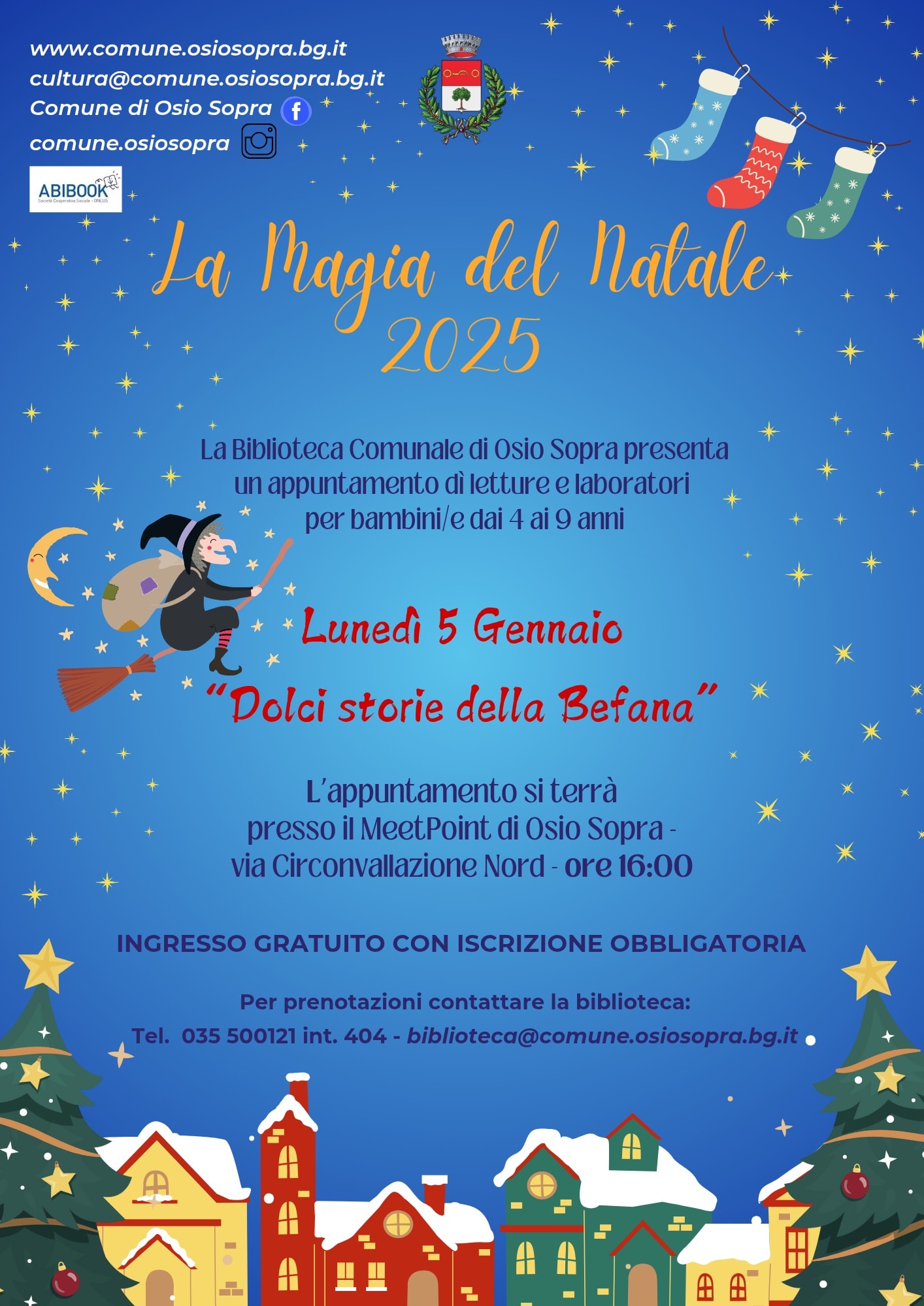 La magia del Natale non finisce mai! La Biblioteca Comunale di Osio Sopra invita tutti i piccoli sognatori a un pomeriggio speciale dedicato alla vecchina più amata d'Italia.