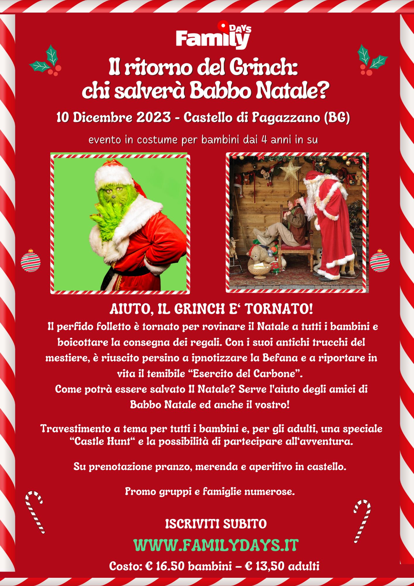 Il 10 dicembre 2023 arriva la prima edizione del nuovo format natalizio Family Days “Il ritorno del Grinch: chi salverà Babbo Natale? “: un evento dove i bambini (dai 4 anni in su) potranno vivere appieno l’ atmosfera natalizia vivendo in prima persona una divertente e magica esperienza travestiti da piccoli elfi per un giorno e far parte della fantastica crew degli aiutanti di Babbo Natale!I genitori /adulti oltre a poter partecipare all’evento travestiti nei panni dei cattivi dell’Esercito del Carbone, avranno la possibilità di conoscere da vicino il bellissimo Castello Visconteo con uno speciale “Castle Game” a loro dedicato: divisi in gruppi attraverseranno le varie zone del castello con indovinelli e domande speciali e ne scopriranno storia e varie curiosità. Tutti i bambini, anche fratellini /sorelline più piccoli sono invitati a portare la propria letterina per Babbo Natale: potranno infatti consegnarla direttamente a Babbo Natale in persona.