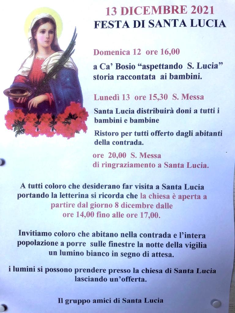 Domenica 12 dicembre alle 16 "Aspettando Santa Lucia", con la storia raccontata ai bambini. Lunedì 13 dicembre la messa sarà celebrate alle 15.30 (al termine della quale Santa Lucia distribuirà doni a bambine e bambini con ristoro offerto dagli abitanti della contrada. Alle 20 messa di ringraziamento. La chiesa sarà aperta dall'8 dicembre, dalle 14 alle 17, per la consegna delle letterine.