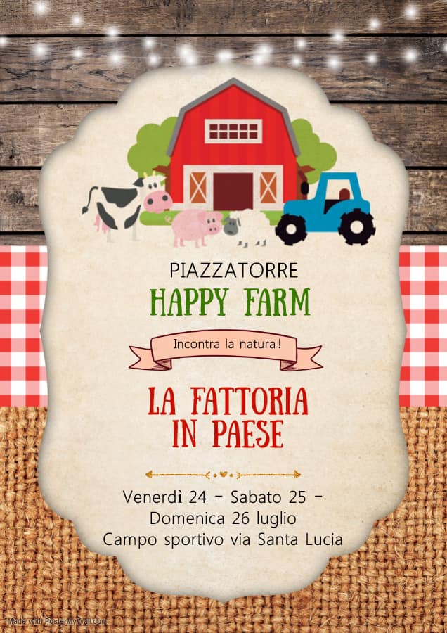 Da Venerdì 24 a Domenica 26 presso il Campo Sportivo Comunale di Piazzatorre si terrà Happy Farm: la fattoria in paese. Tutti i bambini potranno incontrare asini, pulcini, caprette e tanti altri animali della fattoria.