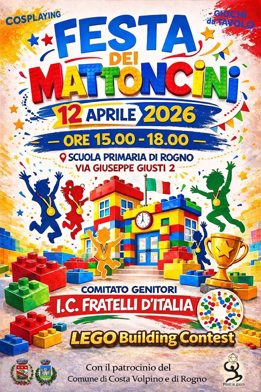 Domenica 12 aprile dalle 15:00 alle 18:00, presso la scuola primaria di Rogno, in via Giuseppe Giusti 2, si terrร la "Festa dei mattoncini", un pomeriggio all'insegna della creativitร attraverso un Lego Building Contest.