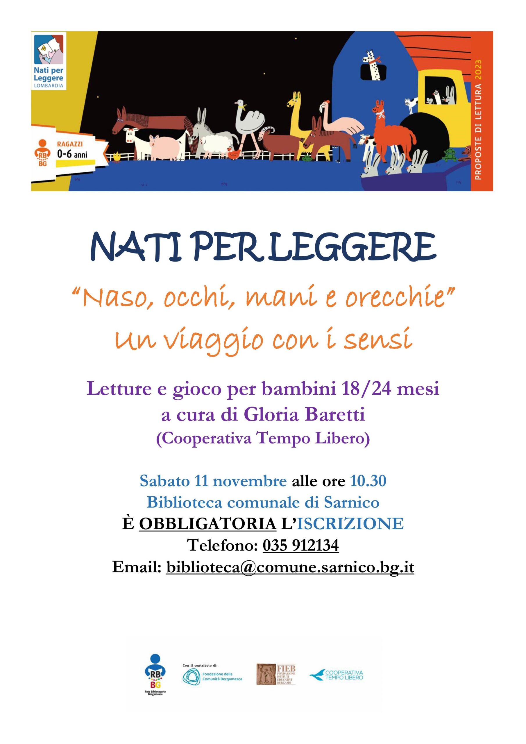 Sabato 11 novembre, alle ore 10.30, presso la Biblioteca di Sarnico, si terrà Nati per leggere, un progetto di letture e gioco per bambini di 18/24 mesi a cura di Gloria Baretti della Cooperativa Tempo Libero dal nome "Naso, occhi, mani e orecchie - Un viaggio con i sensi", un viaggio per piccoli lettori alla scoperta del mondo dei libri, da esplorare con “tutti i sensi”.