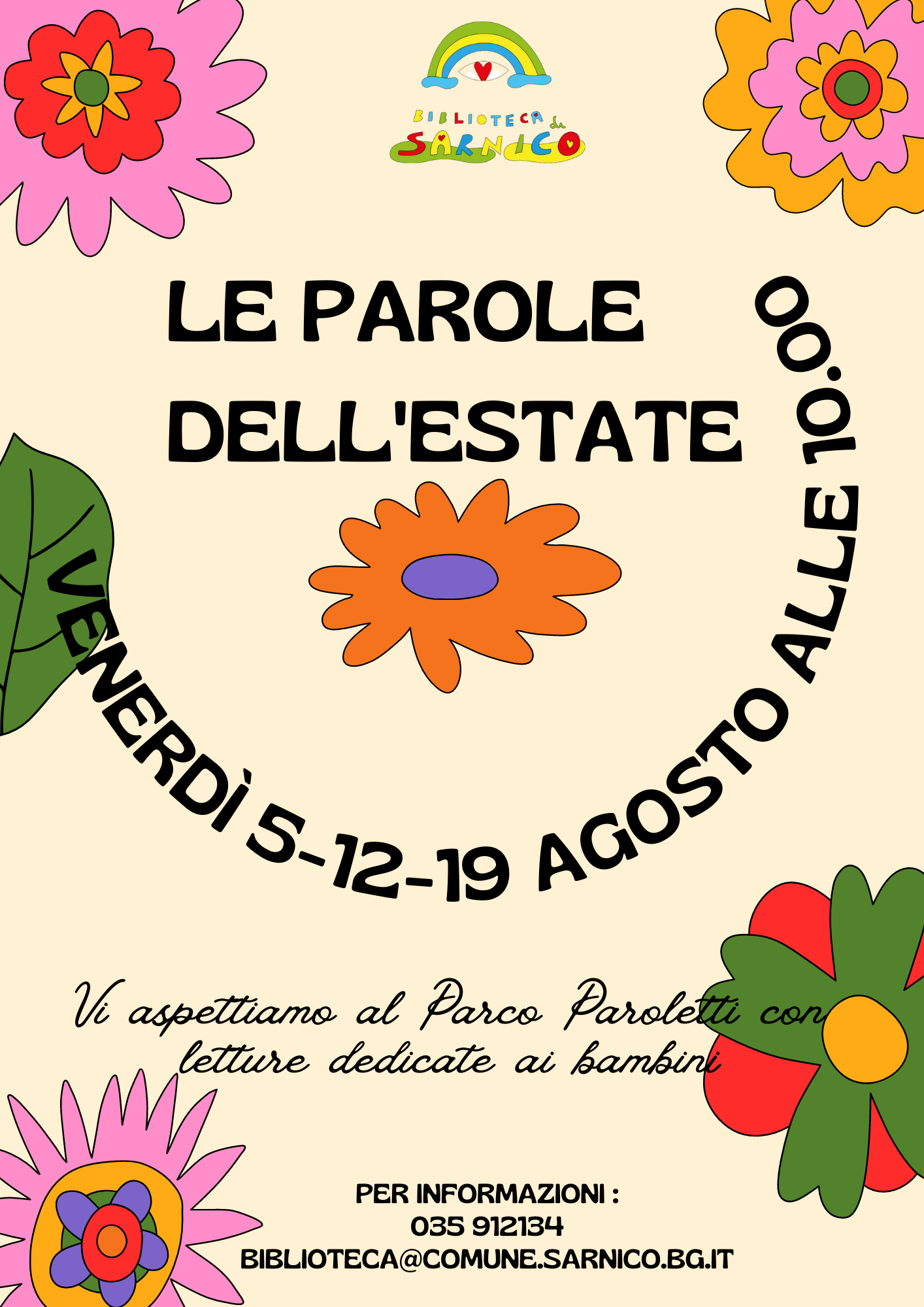 La Biblioteca di Sarnico, propone per tre venerdì di agosto, presso il Parco Paroletti, "Le parole dell'estate", letture dedicate ai bambini.