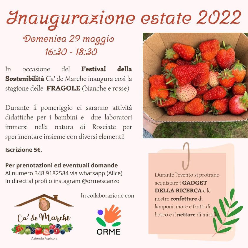 In occasione del Festival della Sostenibilità Ca' de Marche inaugura così la stagione delle Fragole (bianche e rosse). Durante il pomeriggio ci saranno attività didattiche per i bambini e due laboratori immersi nella natura di Rosciate per sperimentare insieme con diversi elementi. Armatevi di pazienza, di un paio di forbici e di buona volontà per raccogliere quante più fragole riuscite!