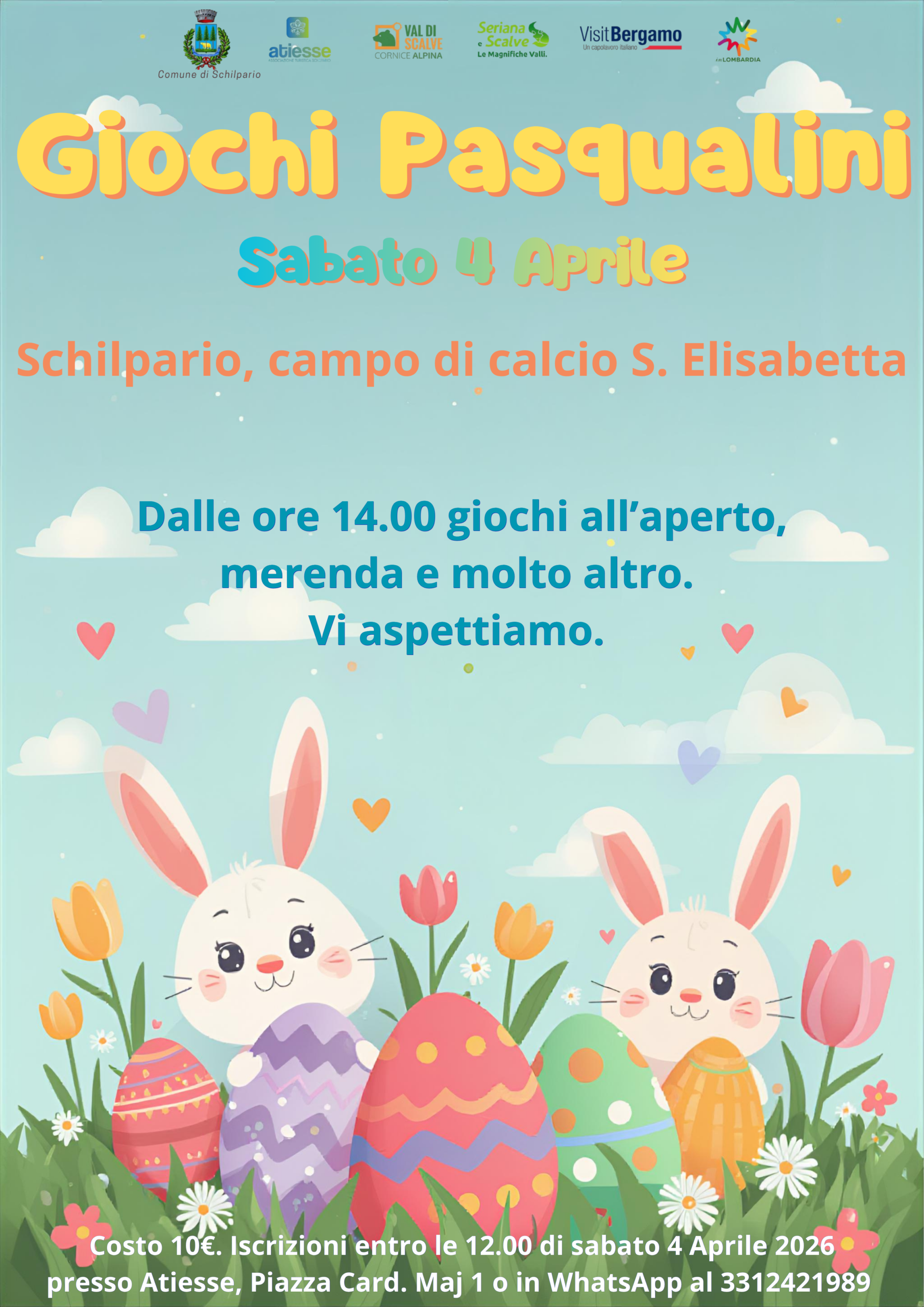 Sabato 4 Aprile, Atiesse Schilpario, propone, presso il campo di calcio di S. Elisabetta, una giornata dedicata all'animazione per i piรน piccoli, con giochi all'aperto, merenda e molto altro ancora a partire dalle 14.