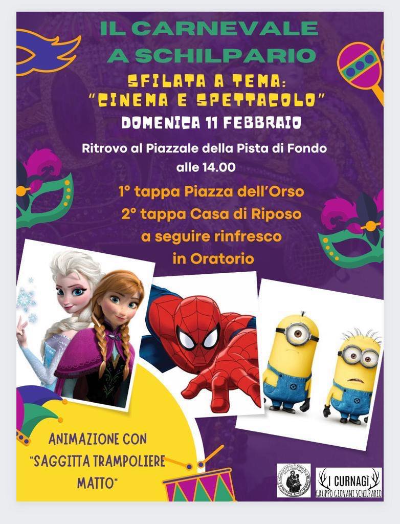 Domenica 11 febbraio il ritrovo sarà alle ore 14:00 al piazzale della Pista di Fondo di Schilpario. Da lì partirà la sfilata con corteo lungo le vie del paese. A seguire rinfresco in oratorio e animazione con "Saggitta trampoliere matto".