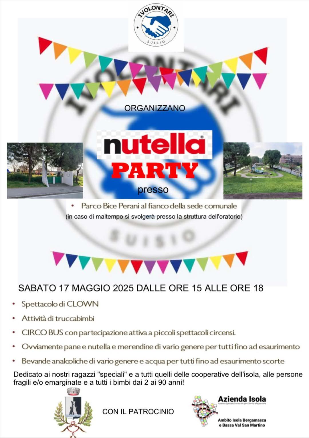 Le associazioni VolontARE, SUISIO e ARI, con il patrocinio dell'Ambito Isola Bergamasca e Bassa Val San Martino, organizzano il Nutella Party, un evento pensato per promuovere l’inclusione e il benessere della comunità. Durante l’evento, saranno offerte numerose attività per tutti i partecipanti, tra cui: