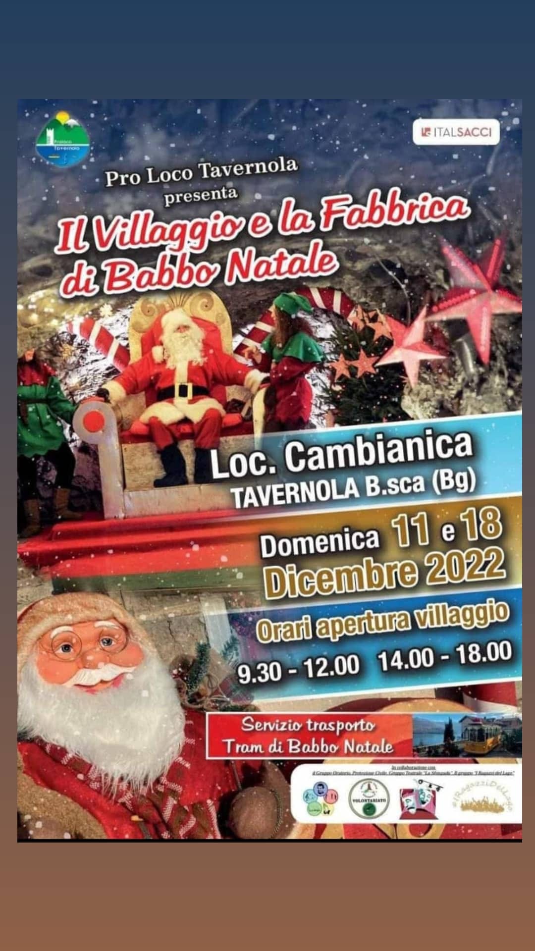 Domenica 11 e 18 dicembre 2022 a Tavernola Bergamasca, in località Cambianica, si aprono le porte del villaggio incantato della fabbrica di Babbo Natale. I folletti e gli gnomi vi aspettano, potrete vedere gli aiutanti di Babbo Natale al lavoro e far diventare realtà quello che fino ad ora è stato un sogno. Insieme stanno preparando i doni da consegnare a tutti i bambini che avranno inviato la letterina. Quest’anno ci saranno anche le renne di Babbo Natale che faranno animazione nel villaggio.