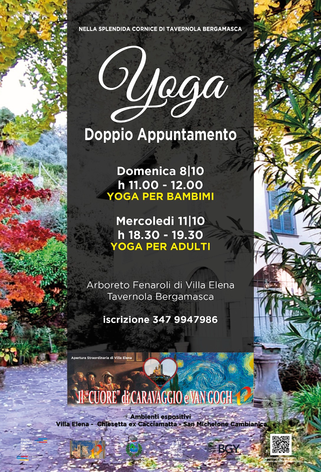 Nell'ambito dell'evento "Nel cuore di Caravaggio e Van Gogh" che si terrà dal 5 al 16 ottobre a Tavernola Bergamasca, domenica 8 ottobre alle ore 11.00 si terrà una lezione di yoga per bambini presso l'arboreto Fenaroli di Villa Elena a Tavernola Bergamasca.