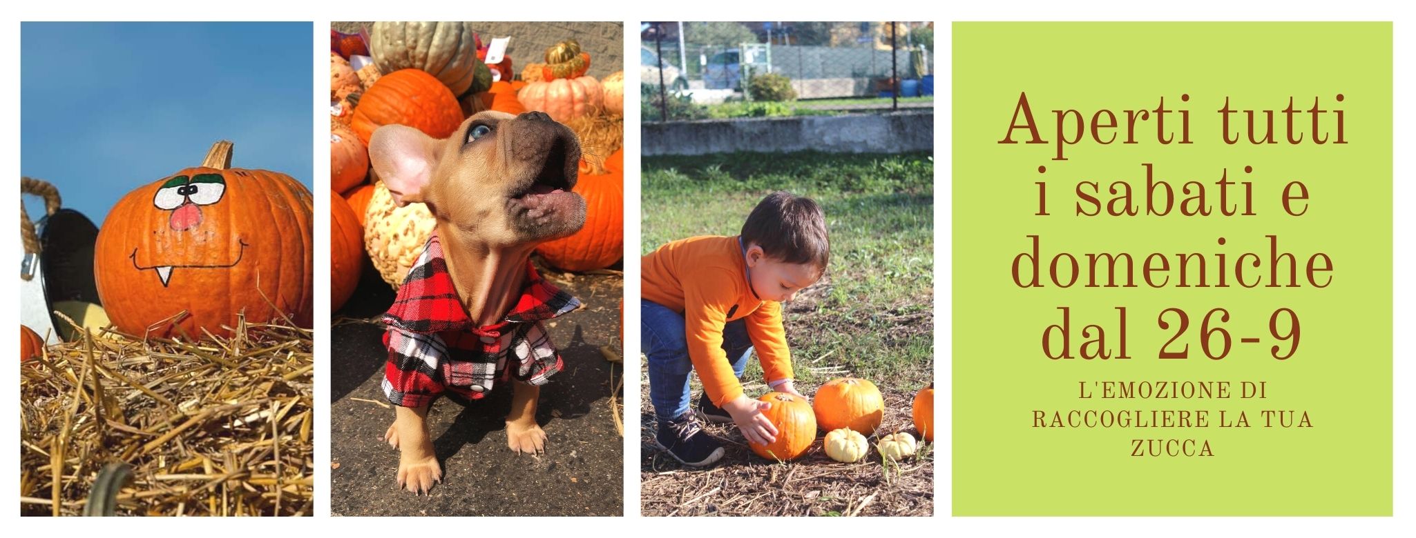 L'ingresso al campo è gratuito per tutti e all'interno bimbi e adulti potranno girovagare alla ricerca della zucca perfetta o quella più' simpatica. All'interno del giardino ci saranno anche delle "postazioni decoro" in cui i bimbi potranno cimentarsi nel dare un volto alla loro scelta. Inoltre ci saranno i giochi "di una volta" con materiali naturali e a tema autunnale come lo zucca tris o il gioco dei legnetti. Ci saranno anche eventi a tema come sfilate di moda bimbi in tema autunnale. Ci sarà la possibilità di acquistare i prodotti come il mais da pocorn o un miele di altissima qualità prodotto proprio con i fiori dell'azienda agricola.