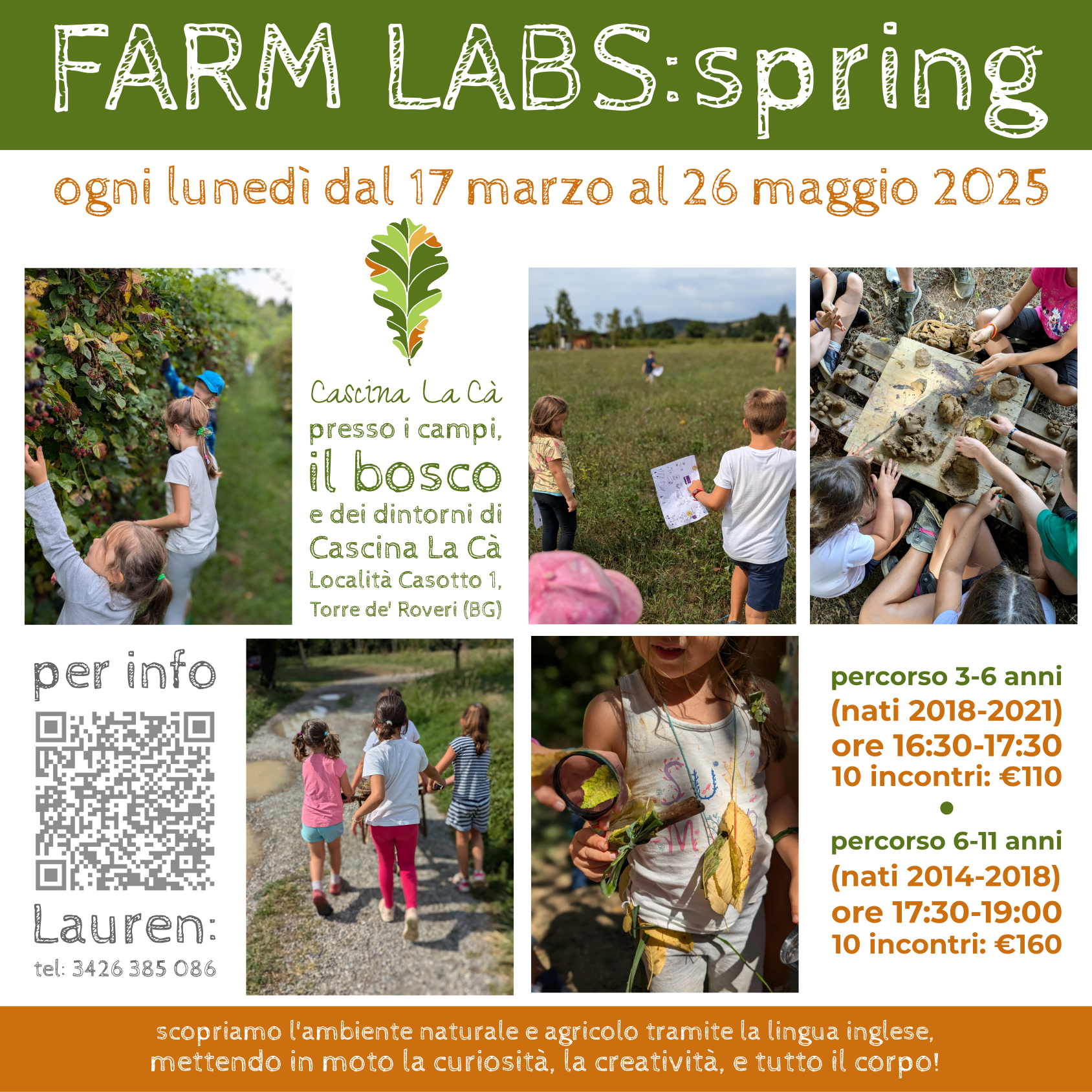 - Percorso 6-11 anni: si creerà un farm journal, ovvero un quaderno di osservazioni, giochi, arte, esperimenti e strumenti pratici. Durante gli incontri ci saranno attività utili a consolidare le competenze acquisite. Alla fine del percorso, ogni bambino riceverà un feedback personalizzato, con suggerimenti concreti su come sviluppare al meglio le proprie competenze nella lingua inglese.