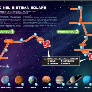 Lo scopo dell’exhibit “Sistema solare” è principalmente quello di far cogliere al visitatore l’enormità delle distanze nell’Universo e la piccolezza, in confronto a tali distanze, degli oggetti che lo popolano (stelle, pianeti e altri oggetti minori). La scala scelta sia per le dimensioni dei pianeti sia per le distanze tra questi è 1 : 6 000 000 000 [un metro nel modello corrisponde a 6 000 000 di chilometri nella realtà]. Se percorrerete quindi il viaggio nel sistema solare passeggiando per la città, incontrerete pianeti delle dimensioni (in scala) di granelli di sabbia o sassolini, dispersi su una distanza di circa 750m. Nel nostro modello, la stella più vicina a noi (Proxima Centauri) sarebbe rappresentata da una sfera di 3,3 cm collocata a New York.