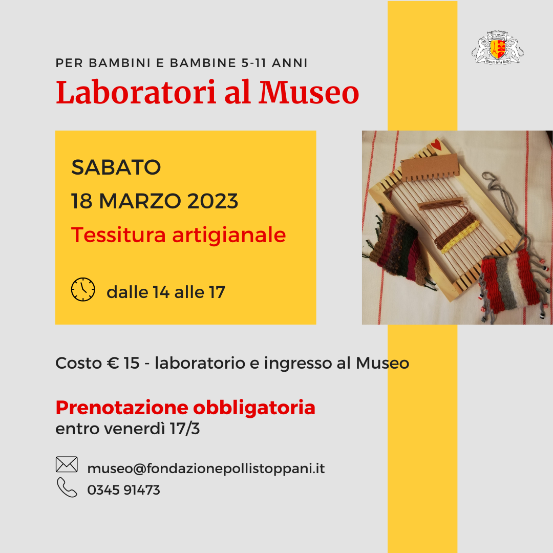 Al Museo della Valle di Zogno un laboratorio per bambini e bambine dai 5 agli 11 anni. Tema del pomeriggio la tessitura artigianale. La finalità del laboratorio è di apprendere l'utilizzo del telaio e delle sue componenti (trama, ordito, spoletta), conoscere come si crea un tessuto a partire dal filato, aumentare la coordinazione visiva-manuale attraverso la meccanica dell’intreccio. Conoscere la storia della Manifattura tessile di Zogno, di cui era proprietario il fondatore del Museo, l’avv. Vittorio Polli, e apprendere il valore che l’impresa tessile ha avuto nello sviluppo dell’economia e del mondo del lavoro della Val Brembana.
