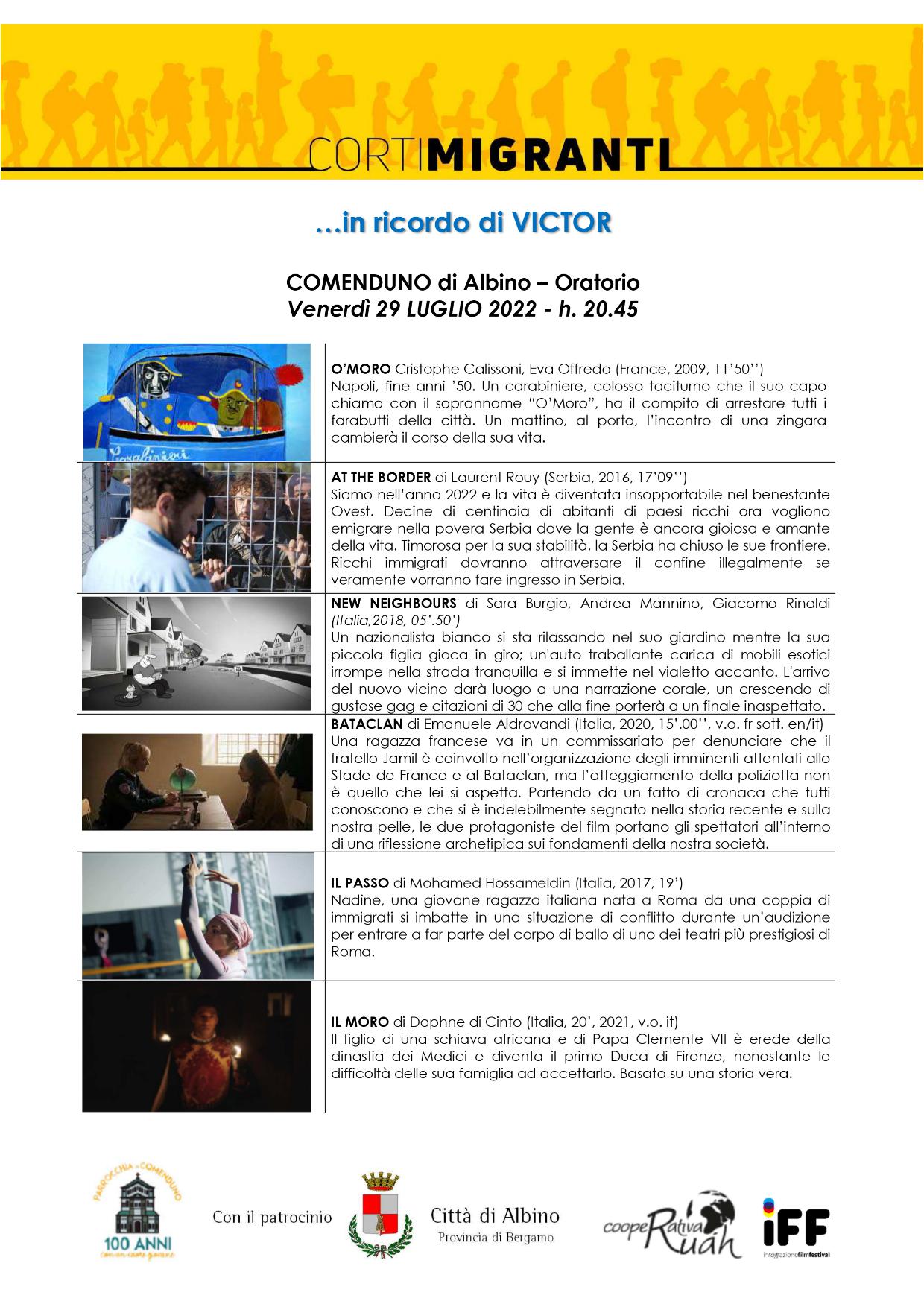 Venerdì 29 luglio alle 20.45 la Parrocchia di Comenduno in collaborazione con Cooperativa Ruah e IFF Integrazione Film Festival propone, con il patrocinio del Comune di Albino, una serata di cortometraggi sul tema dell'integrazione. Occasione per ritrovarsi in memoria di Victor, uno dei protagonisti della storia scritta sull’accoglienza (a cui si stanno ancora aggiungendo pagine).