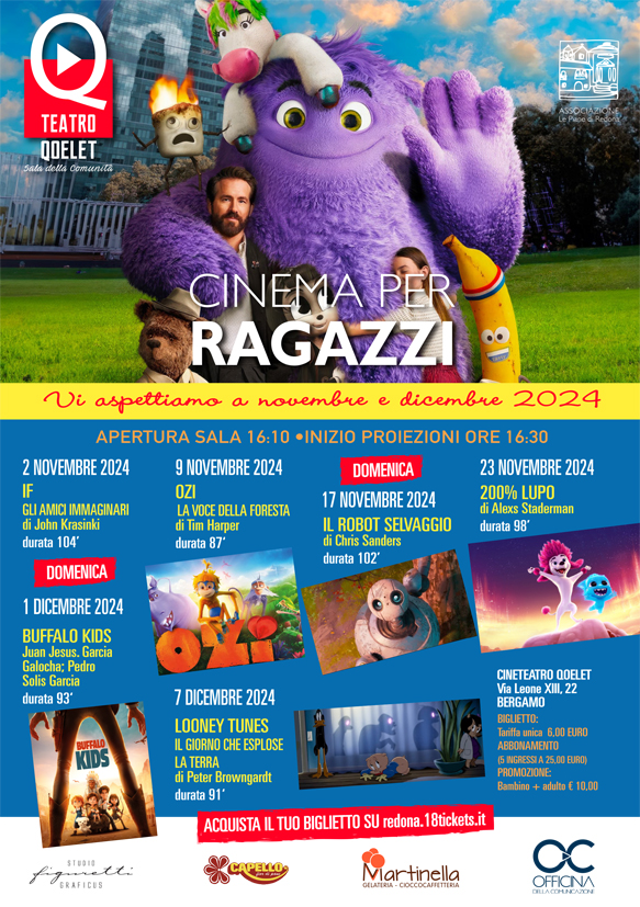 Cinema per ragazzi: numerosi appuntamenti per passare i pomeriggio di novembre e dicembre al cinema Qoelet di Bergamo. In programma 200% Lupo, la storia di Freddy Lupin che, a 14 anni, viene trasformato in un barboncino.