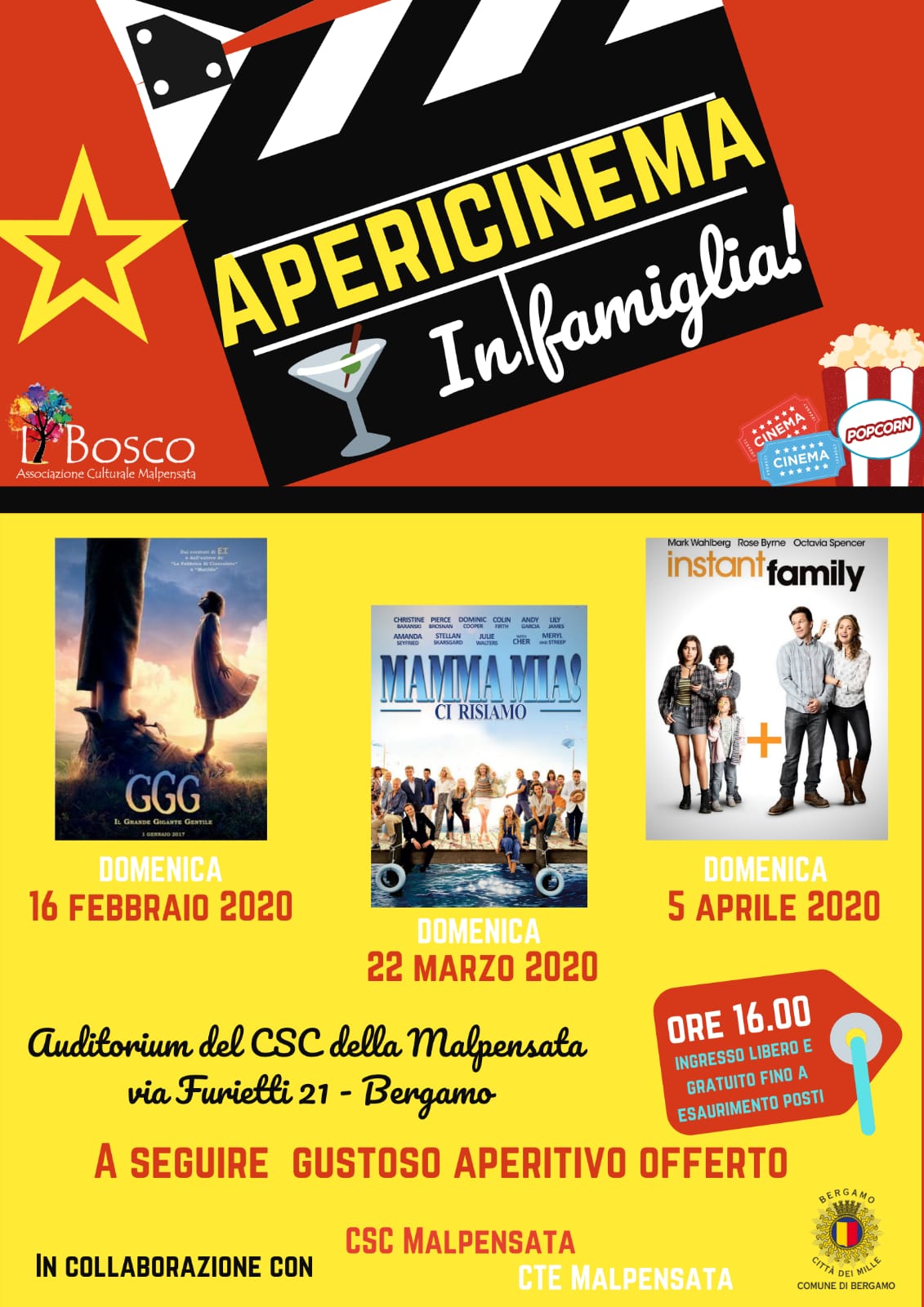 L'Associazione culturale Il bosco in collaborazione con il Centro socio culturale ed il Centro per tutte le Età della Malpensata propone la seconda edizione di "Apericinema in Famiglia!": la proiezione di un film adatto ad ogni età e a seguire un piacevole momento conviviale con aperitivo offerto.