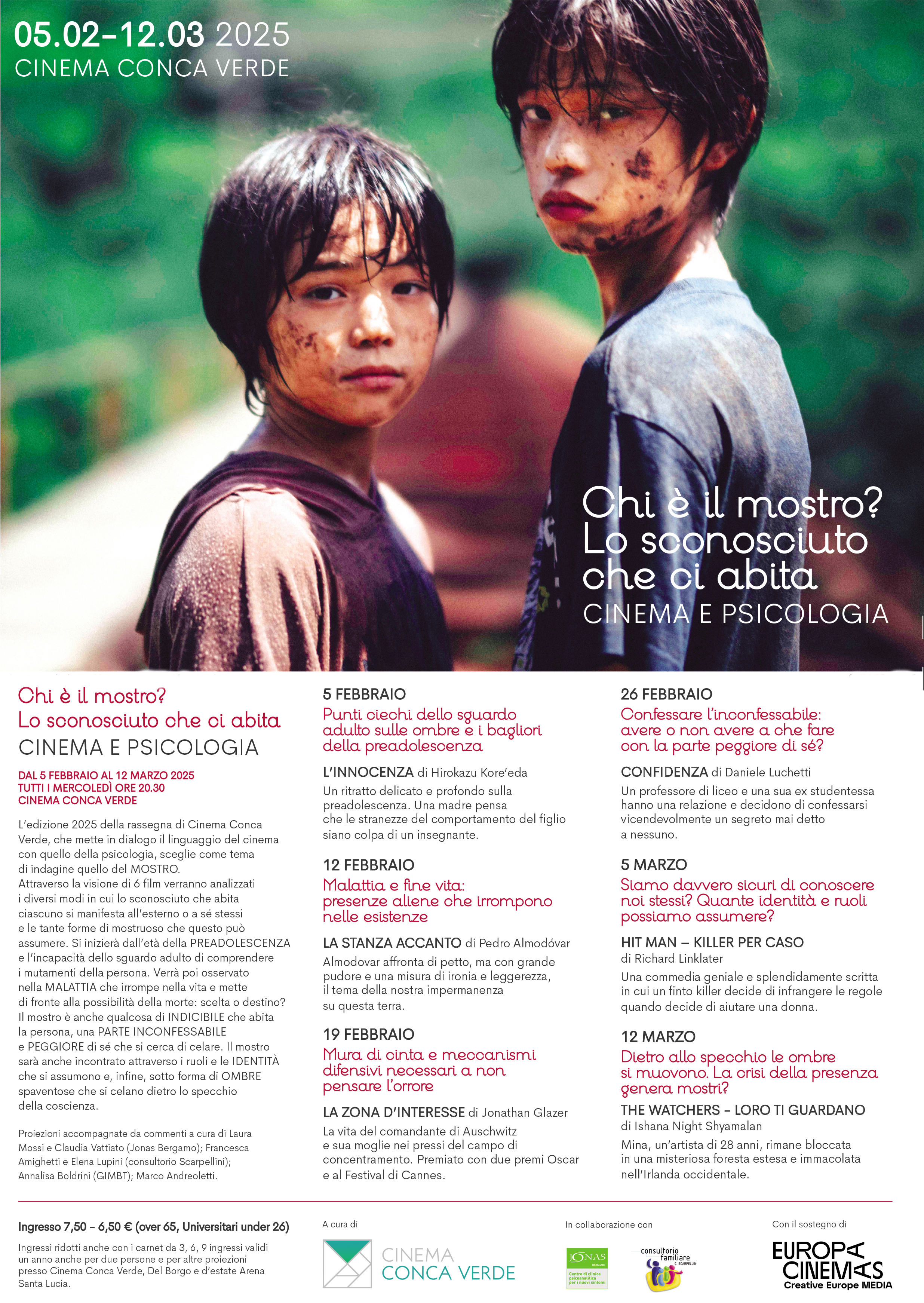 Il tema dell’edizione del 2025 è quello del mostro, inteso come l’estraneo o lo sconosciuto che è racchiuso in ognuno di noi e di cui si può essere più o meno consapevoli. Quella presenza che vive nel nostro inconscio e che si manifesta in forme e modalità diverse. I 5 titoli individuati saranno, come di consueto, accompagnati dall’analisi di 5 psicologi e psicologhe professionisti che accompagneranno il pubblico in un percorso di scoperta e indagine della tematica. La rassegna si svolge ogni mercoledì dal 5 febbraio fino al 12 marzo, alle 20,30, con l’intervento di: Francesca Amighetti e Elena Lupini del Consultorio Scarpellini di Bergamo, Annalisa Boldrini di ASST Pavia, Laura Mossi e Claudia Vattiato di Jonas Bergamo e Marco Andreoletti.