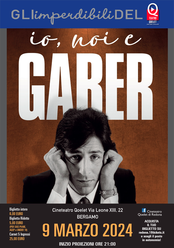 All'interno del ciclo "Gli imperdibili" del Cinema Teatro Qolet viene proiettato il film "Io, noi e Gaber", documentario del 2023 di Riccardo Milani che racconta chi è stato Giorgio Gaber per la musica italiana grazie a filmati e testimoni.