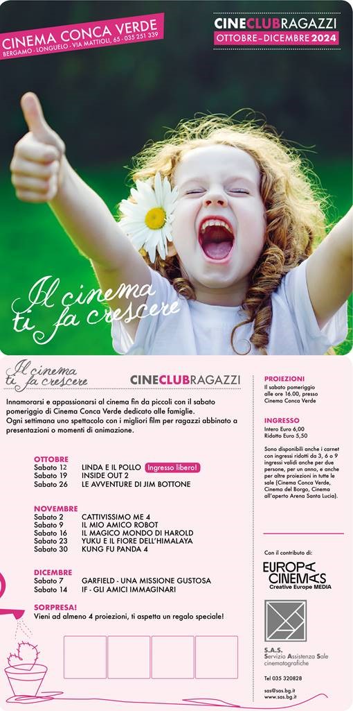 “Il cinema ti fa crescere” CINECLUB RAGAZZI, Innamorarsi e appassionarsi al cinema fin da piccoli con il sabato pomeriggio di Cinema Conca Verde dedicato alle famiglie. Dal 12 ottobre tutti i sabati pomeriggio alle ore 16.00, ogni settimana uno spettacolo con i migliori film per ragazzi abbinato a presentazioni o momenti di animazione. Per chi partecipa a 4 proiezioni, un regalo sorpresa!