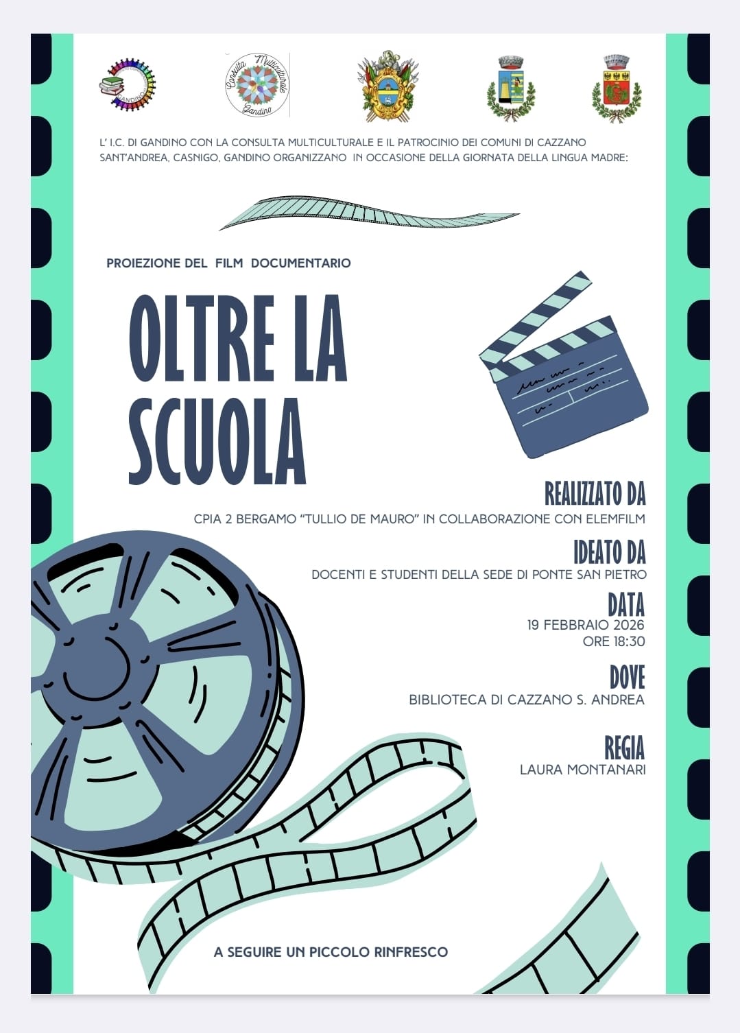 In occasione della Giornata della Lingua Madre, l’I.C. di Gandino, con la Consulta Multiculturale e il patrocinio dei Comuni di Cazzano Sant’Andrea, Casnigo e Gandino, propone la proiezione del film documentario Oltre la scuola.