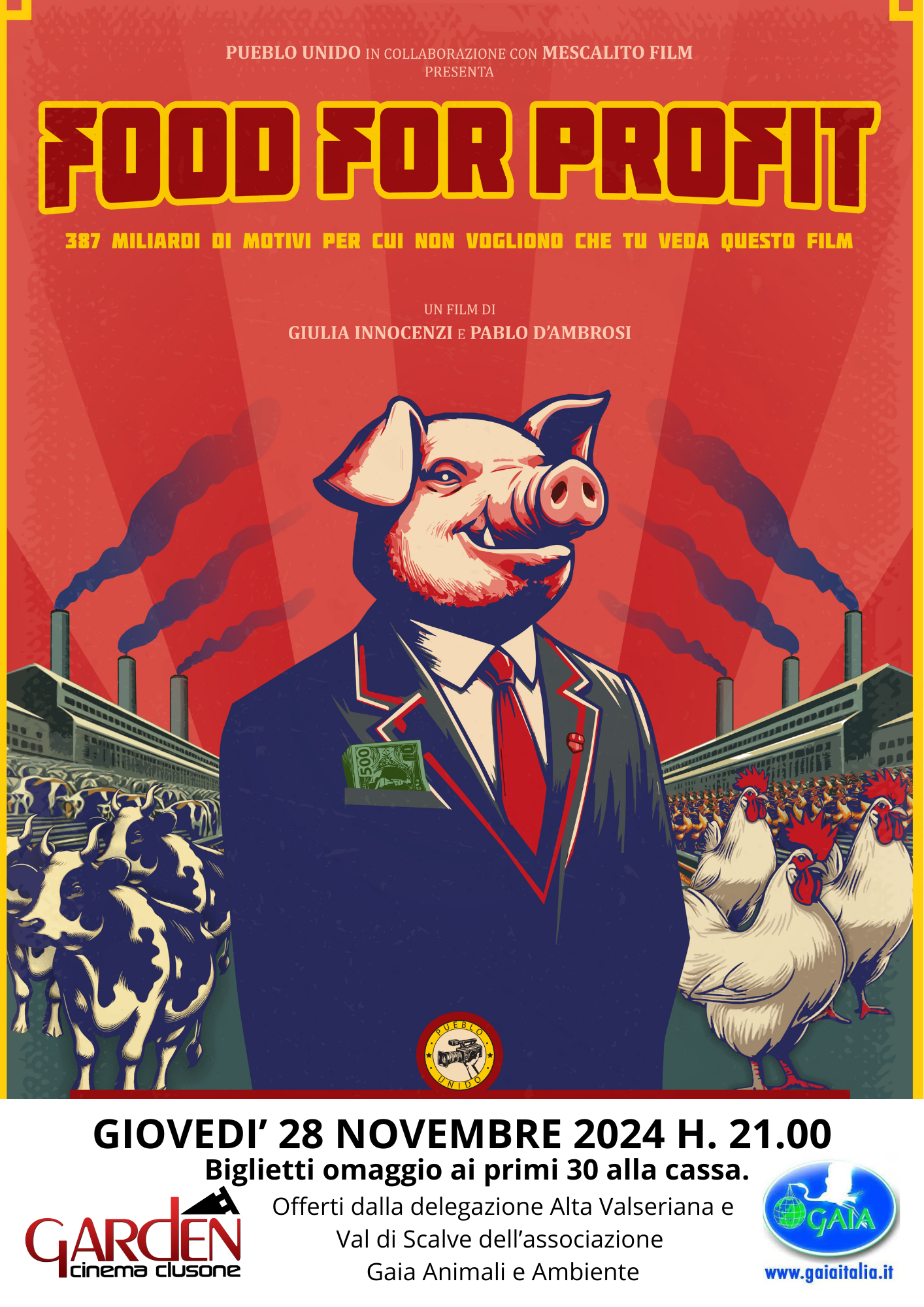 Dopo essere stato ai primi posti nella classifica dei film più visti in Italia quest’anno, trasmesso in parte anche in tv durante la puntata di "Report" su RAI3 a maggio, con un milione e mezzo di spettatori RAI, il documentario "Food for Profit" sarà proiettato anche al Cinema Garden di Clusone giovedì 28 novembre 2024 alle ore 21. Il documentario è uscito nelle sale a fine febbraio con una produzione e distribuzione totalmente indipendenti, ed è diventato un caso cinematografico. È già stato proiettato alcuni mesi fa in alcuni cinema di Bergamo, sta facendo il giro del mondo e ora la delegazione Alta Valle Seriana e Val di Scalve dell'associazione Gaia Animali e Ambiente lo porterà anche in valle.
