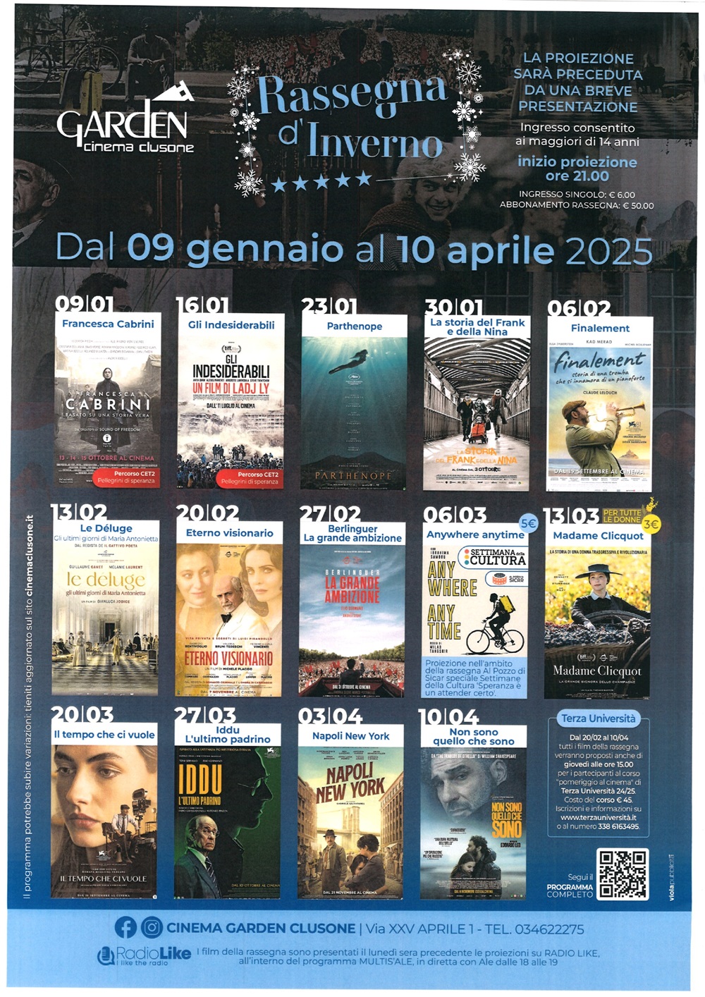 Dal 20 febbraio al 10 aprile 2025 tutti i film della rassegna verranno proposti anche di giovedì pomeriggio alle 15 per i partecipanti al corso “pomeriggio al cinema” di Terza Università 24/25.