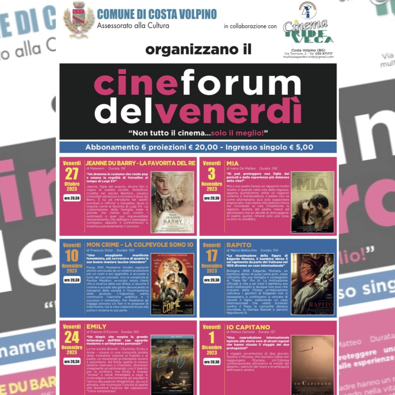 Ingresso singolo 5 euro โ Abbonamento 6 proiezioni 20 euro.