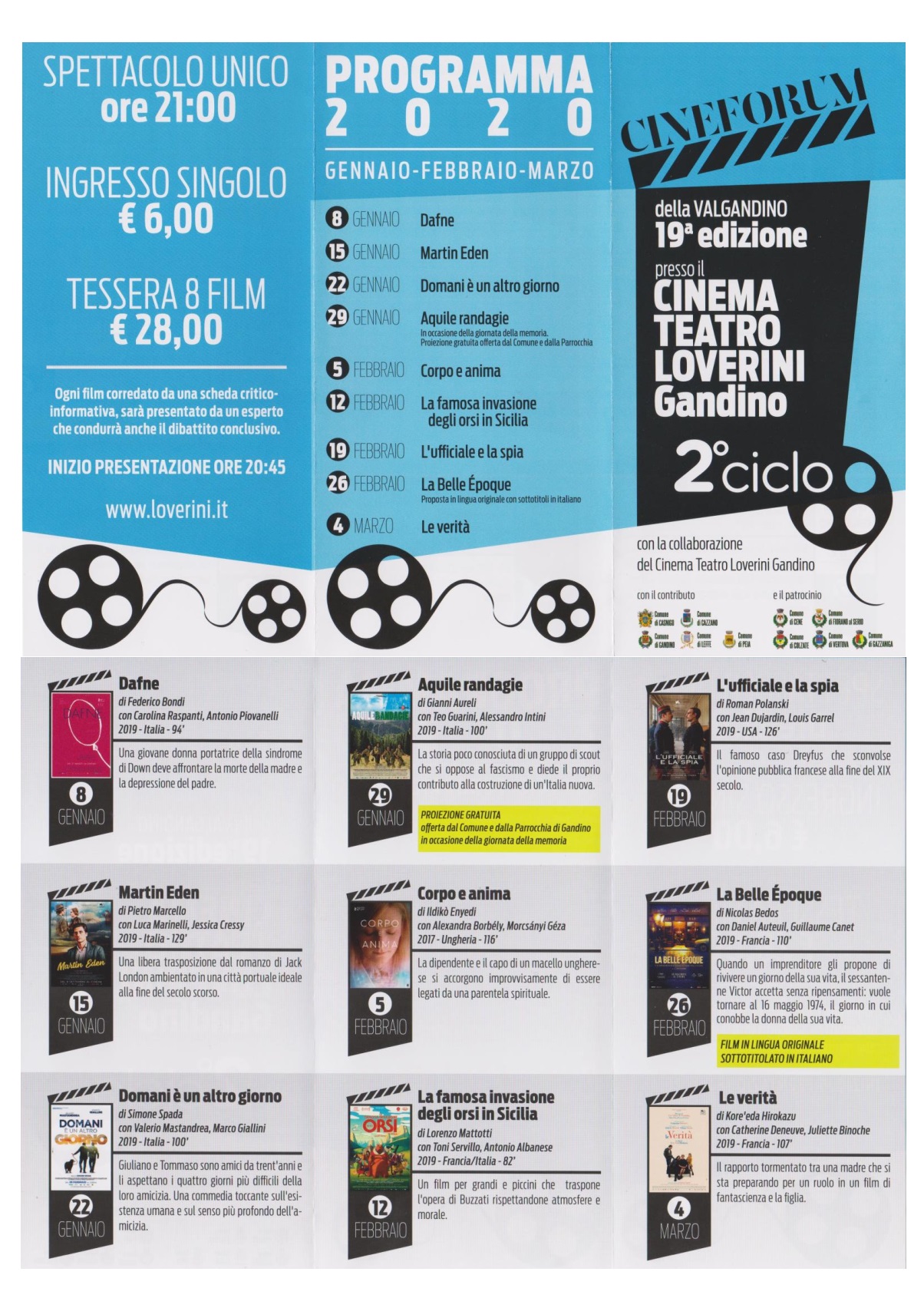 Il CinemaTeatro Loverini di Gandino presenta la diciannovesima edizione del «Cineforum» con la seguente programmazione: