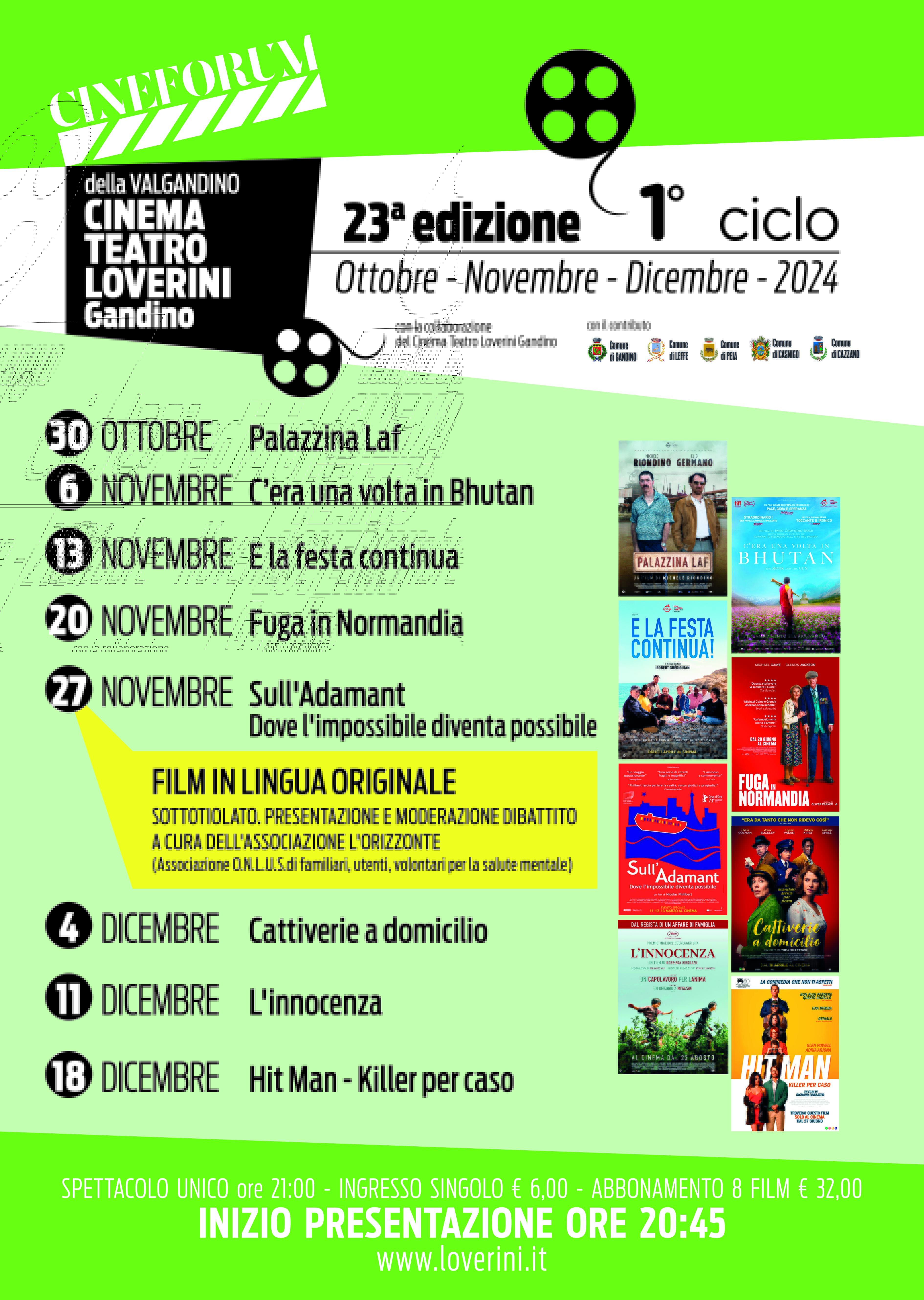 La 23a edizione del Cineforum della Val Gandino, organizzata dal Cinema Teatro Loverini di Gandino, torna con un ricco programma di film che si terranno nei mesi di ottobre, novembre e dicembre 2024. Il primo ciclo prevede otto appuntamenti, con proiezioni che spaziano tra generi e tematiche diverse, offrendo un'ampia varietà di spunti di riflessione e intrattenimento.