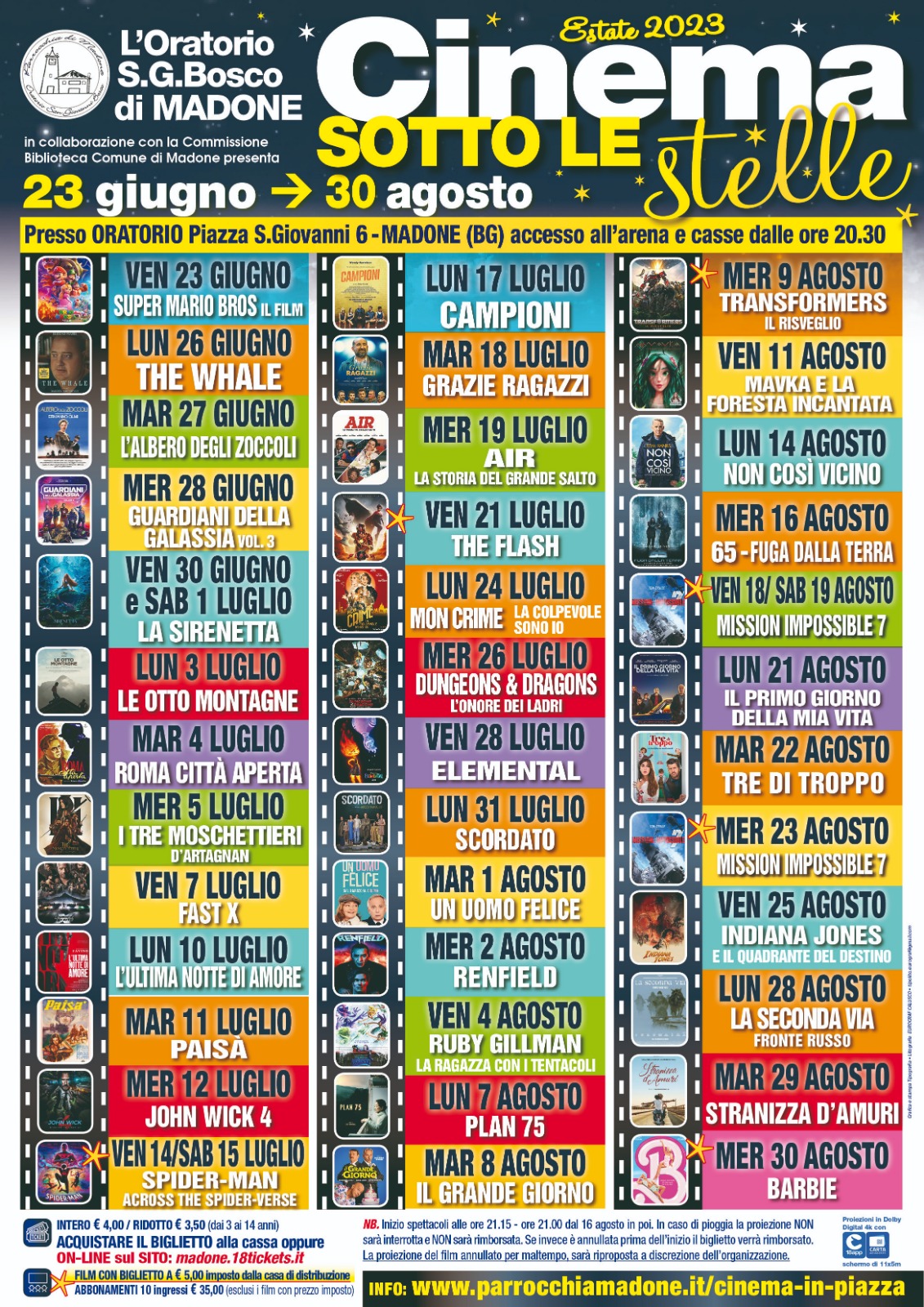 L'arena estiva di Madone, propone una serie di proiezioni all'aperto, saranno presenti numerosi e importanti film.