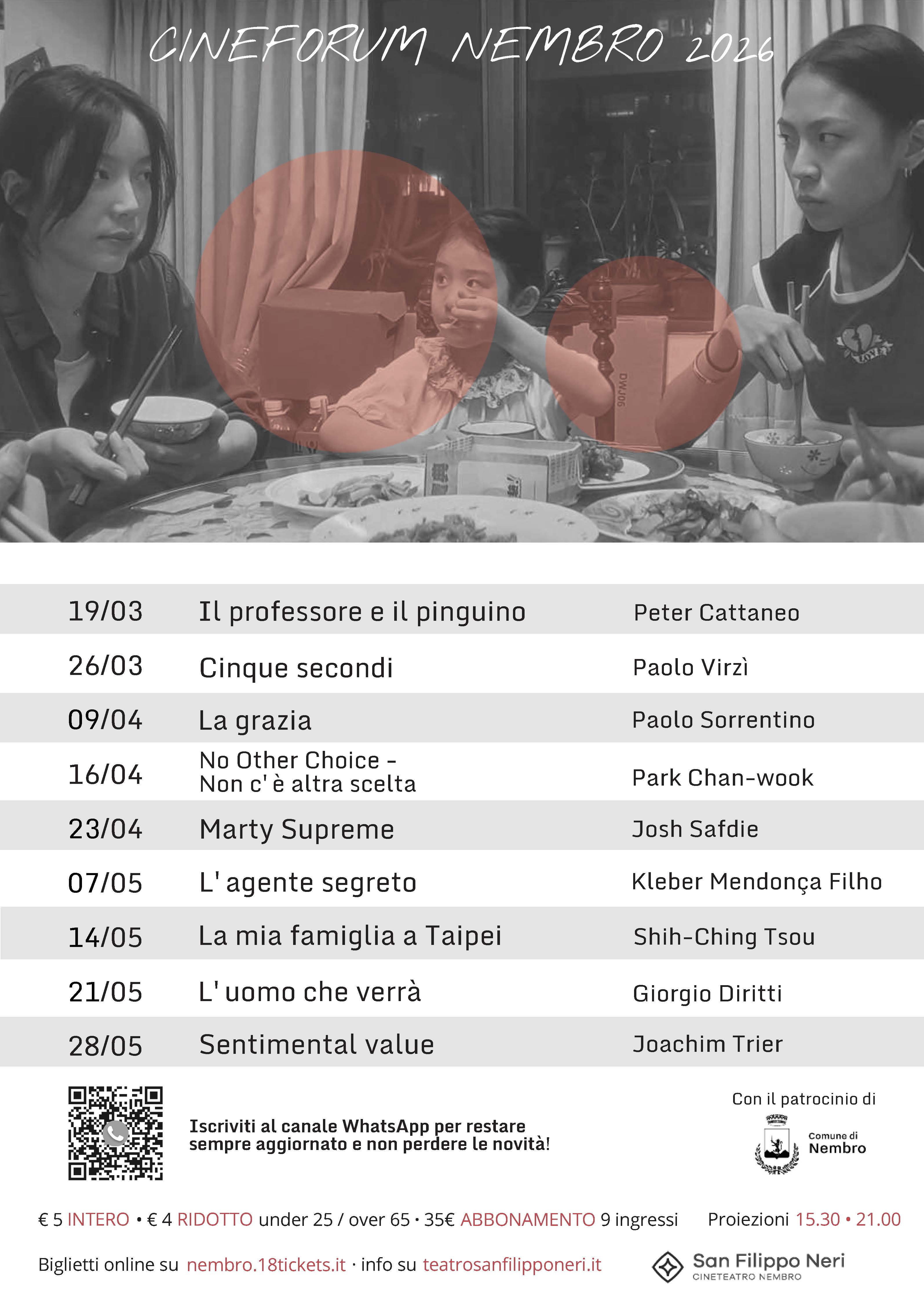 L’appuntamento cinematografico propone la visione di No Other Choice – Non c’è altra scelta, l’ultimo film del celebre regista sudcoreano Park Chan-wook. La pellicola offre uno sguardo intenso e coinvolgente sulle scelte difficili che plasmano le vite dei protagonisti, tra tensione emotiva e riflessioni morali.