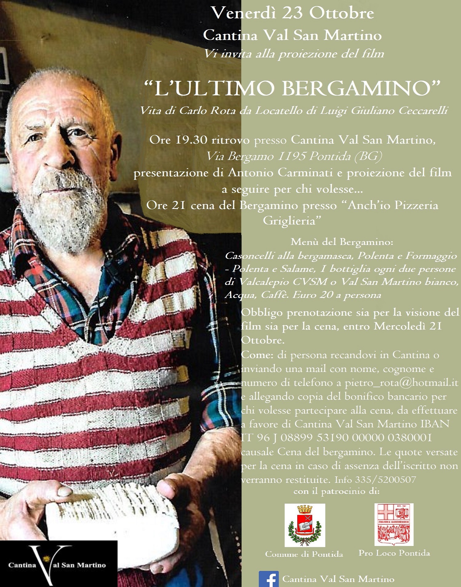 Cantina Val San Martino, insieme al Comune di Pontida e alla Pro Loco Pontida, propone la proiezione della pellicola "L'Ultimo Bergamino", la vita di Carlo Rota da Locatello di Luigi Giuliano Ceccarelli, prodotto dal Centro Studi Valle Imagna, un’importante testimonianza di una tradizione che non deve essere dimenticata.