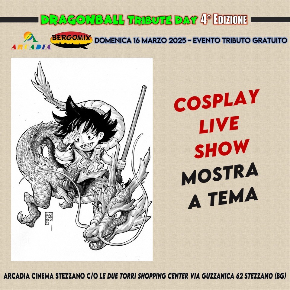 In collaborazione con l’associazione culturale BERGOMIX, domenica 16 Marzo dalle 14.30 alle 18.30, al Cinema ARCADIA di Stezzano, presso Le Due Torri Shopping Center, si celebra il “Dragon Ball Tribute Day 2025”.