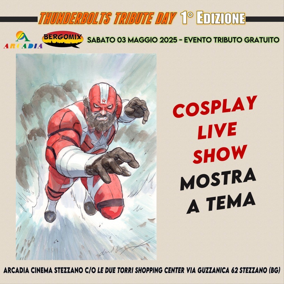 In collaborazione con l’ associazione culturale BERGOMIX, troverete ad attendervi una esclusiva mostra temporanea dedicata al fumetto Marvel “Thunderbolts” con illustrazioni inedite e un simpaticissimo team di cosplay per foto ricordo con l’ omaggio di un albo a tiratura limitata.