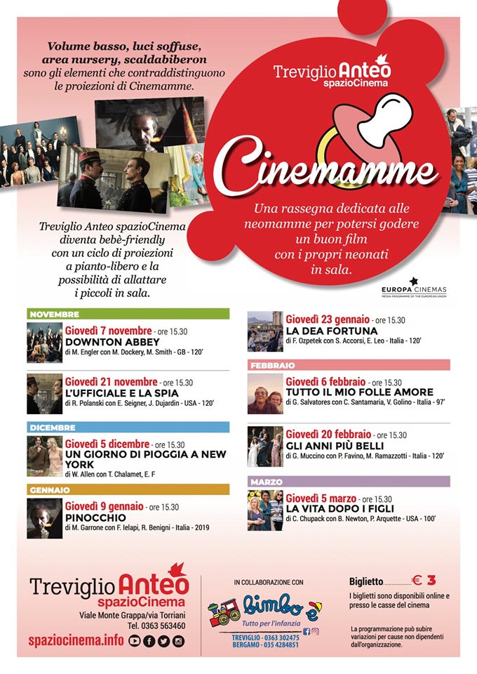 Treviglio Anteo spazioCinema presenta Cinemamme, la rassegna dedicata alle neomamme per potersi godere un buon film con i propri neonati in sala. Volume basso, luci soffuse, area nursery, scaldabiberon sono gli elementi che contraddistinguono le proiezioni di Cinemamme, in un ambiente accogliente per la mamma (o il papà, o i nonni o gli zii) e il neonato. Il cinema diventa bebè-friendly con un ciclo di proiezioni a pianto-libero con la possibilità di allattare i piccoli.