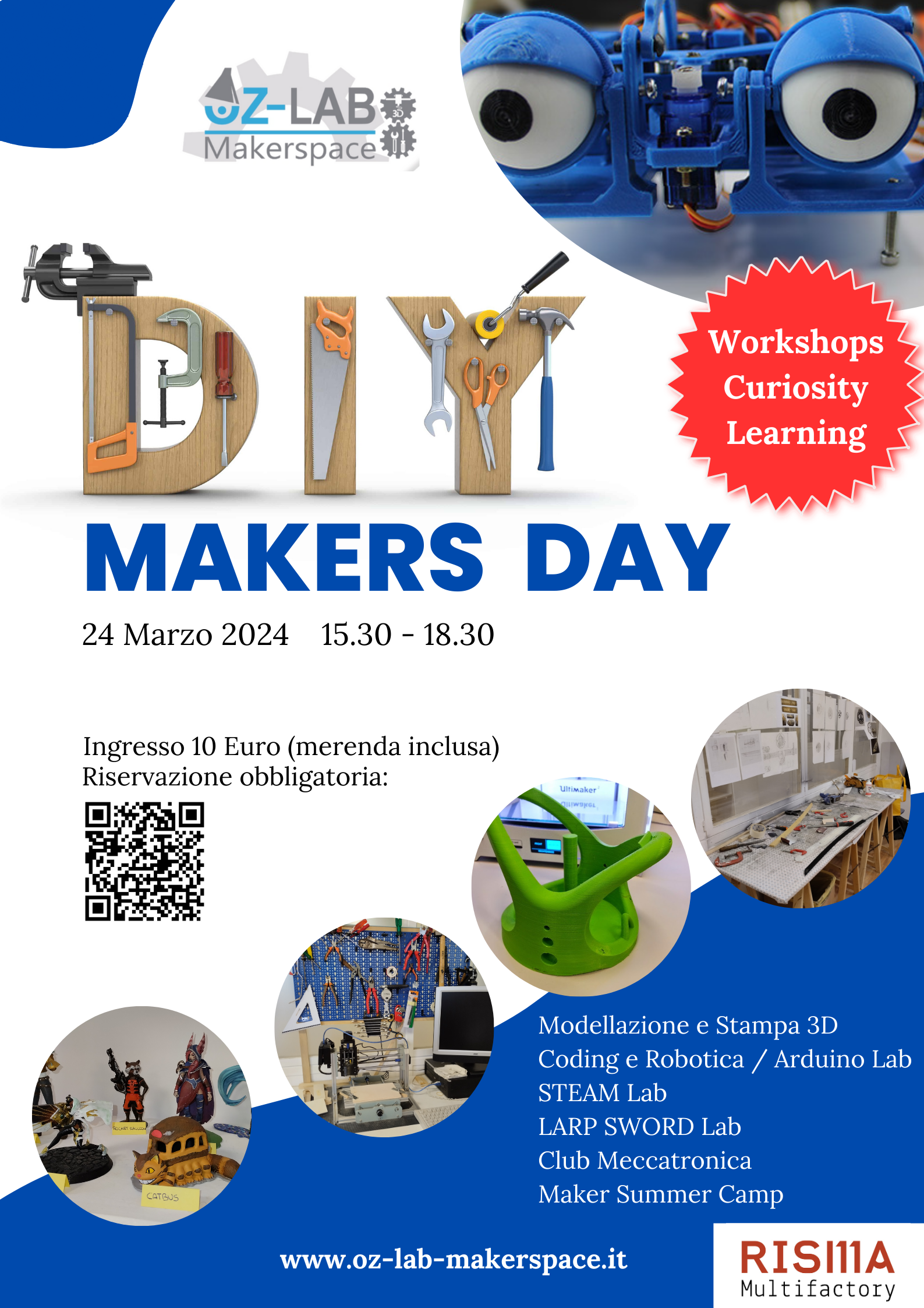 Oz-Lab Makerspace apre le sue porte per una giornata di presentazione dei laboratori e di tutte le sue attività: workshop di modellazione e stampa 3D. CNC, Steam Lab, Larp Sword Lab, Arduino Lab, Coding e robotica.