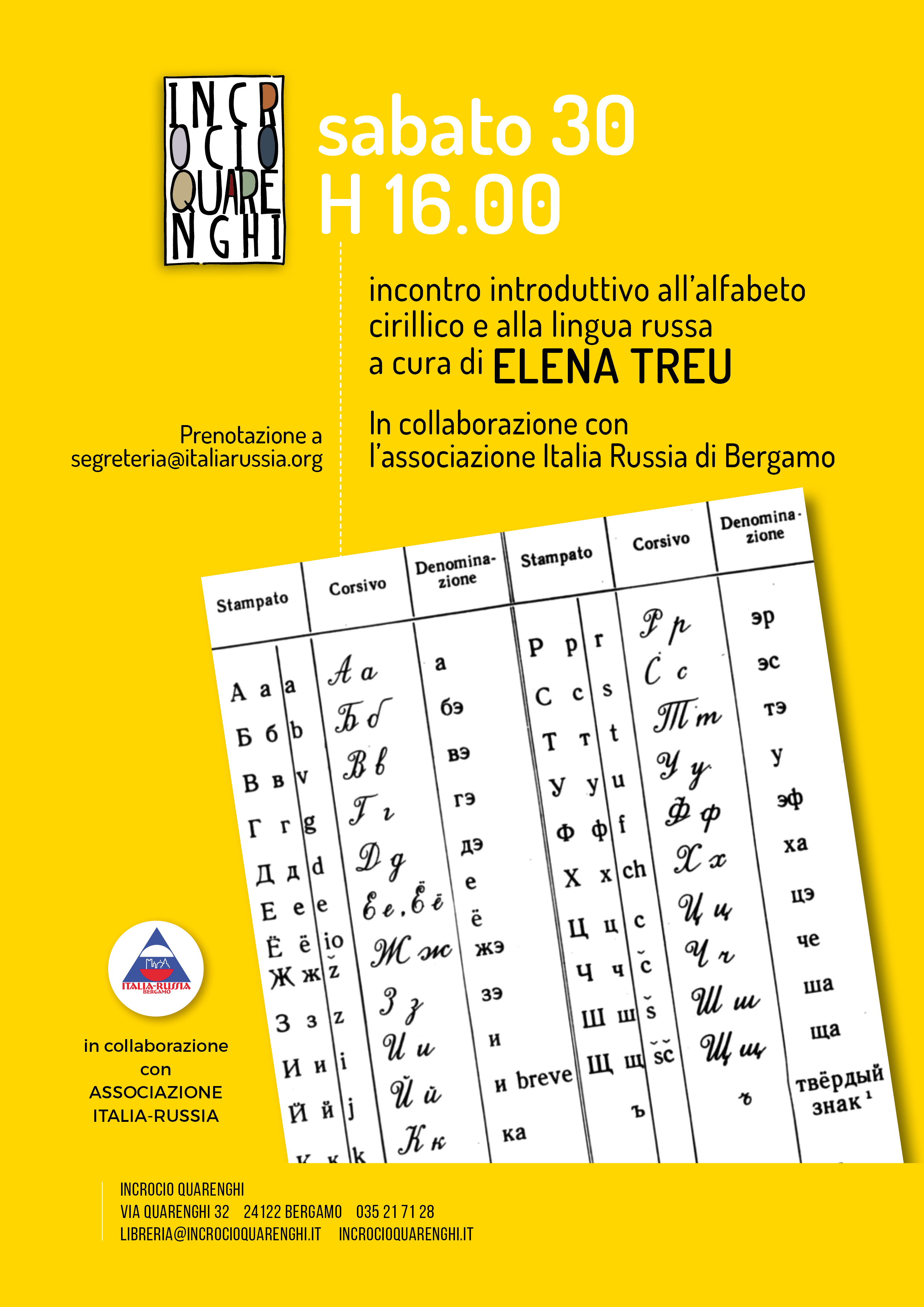 Elena Treu, docente presso l’Università di Bergamo, terrà una lezione introduttiva sull’alfabeto cirillico e la lingua russa presso la Libreria Incrocio Quarenghi.