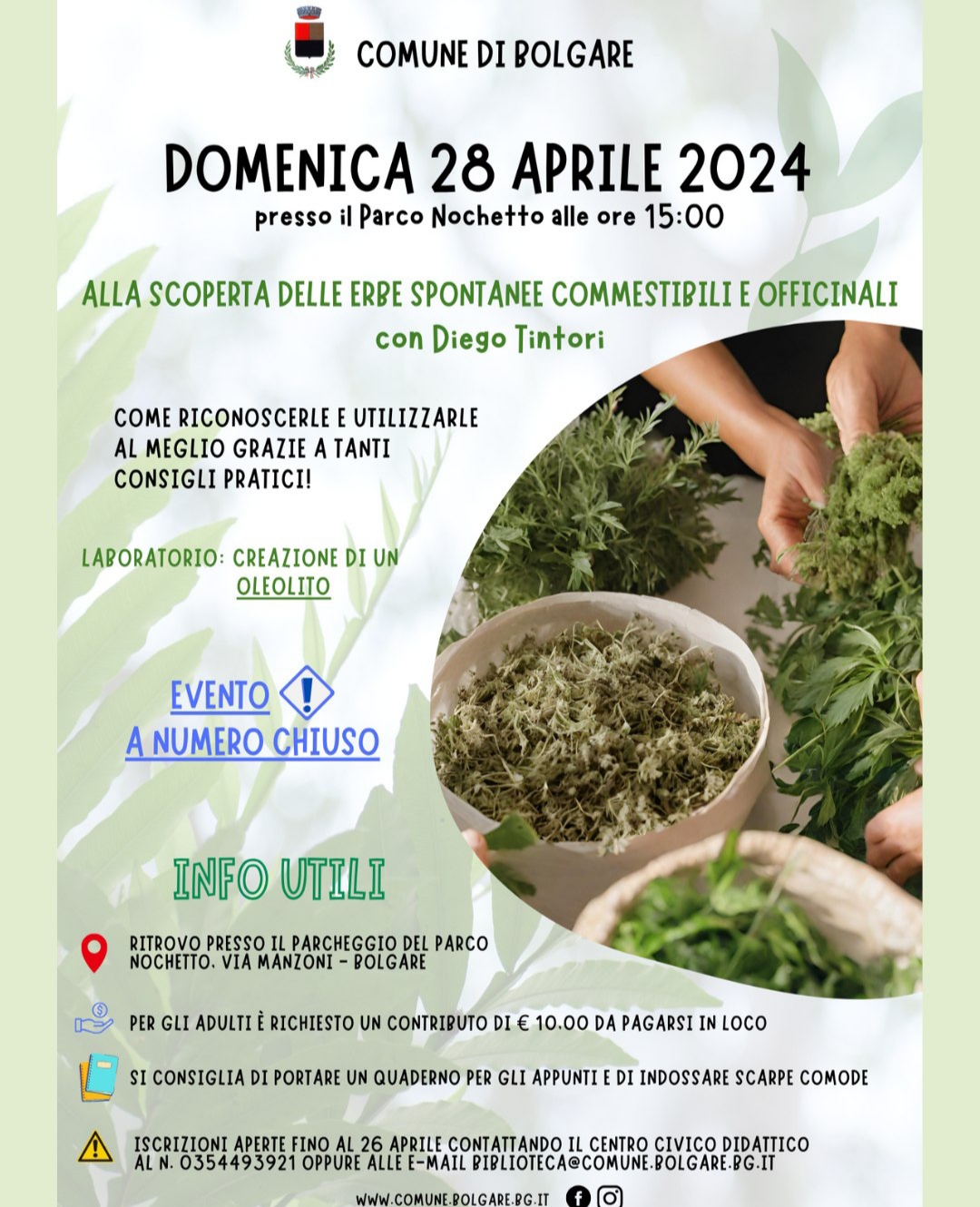 Il comune di Bolgare organizza un laboratorio per riconoscere e utilizzare le erbe officinali. Come riconoscerle e utilizzarle al meglio grazie a tanti consigli pratici! Si consiglia di portare un quaderno per gli appunti e di indossare scarpe comode. Si creerร anche un eleolito.