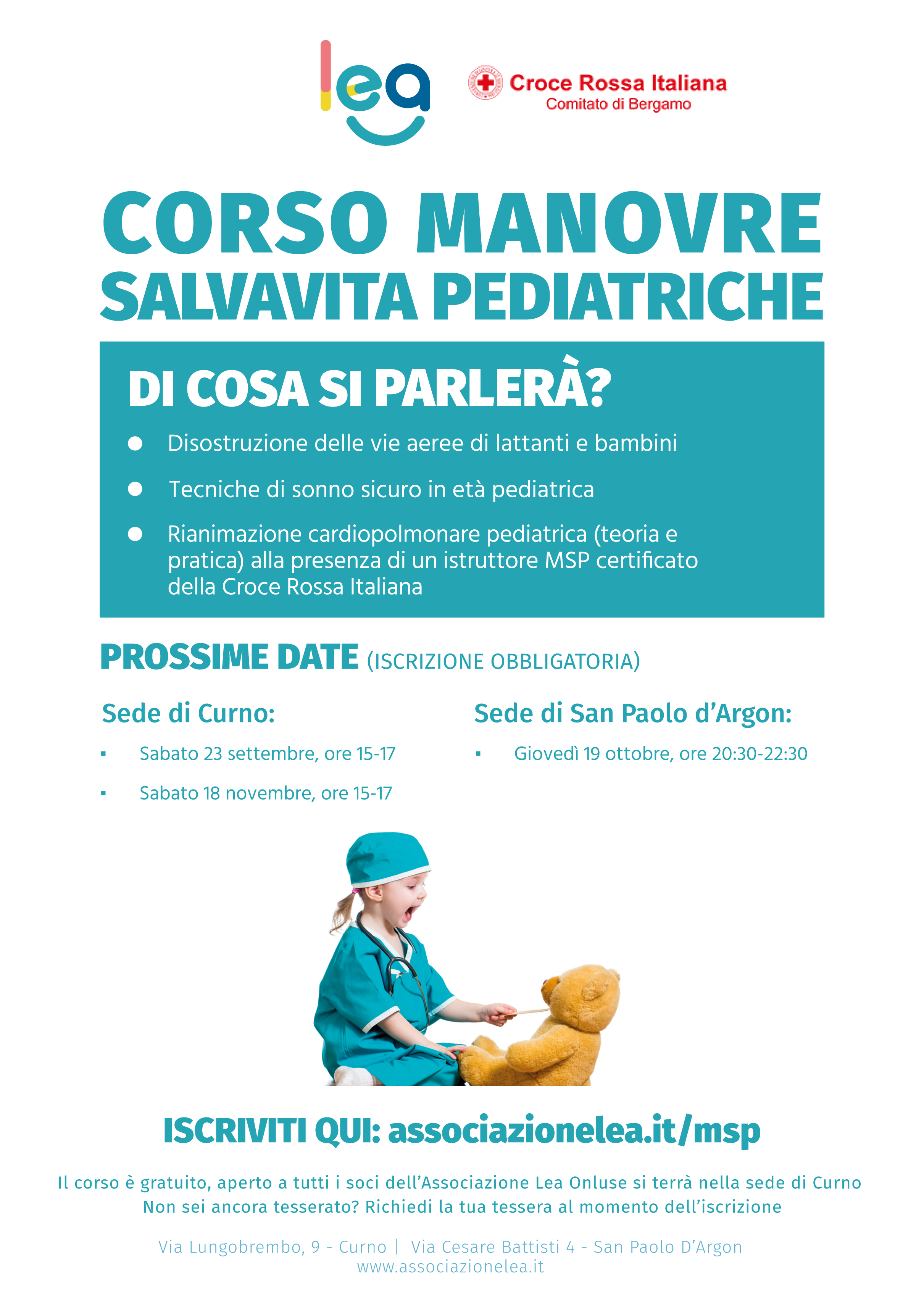 - Rianimazione cardiopolmonare pediatrica (teoria e pratica) alla presenza di un istruttore MSP certificato della Croce Rossa Italiana.