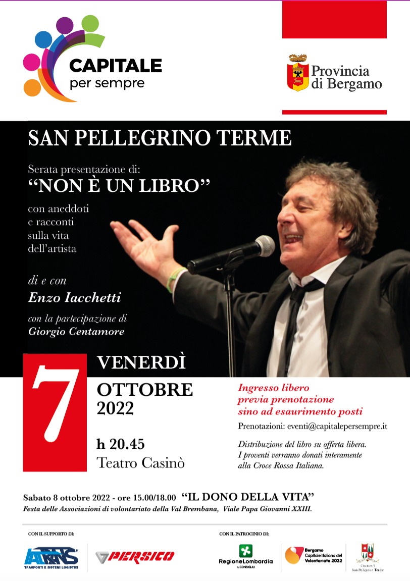 Una serata... differente. Uno spettacolo/presentazione differente. Si riflette, ridendo, e si ride, riflettendo... con Enzo Iacchetti e il suo "Non è un libro". Venerdi 7 ottobre h. 20:45, al Teatro Casinò di San Pellegrino, in occasione della festa delle associazioni della Val Brembana. Pensieri liberi - seppur nati nel momento più duro di reclusione - e aneddoti irresistibili rimbalzeranno con naturalezza tra Enzo e il grande amico e compagno di palco, Giorgio Centamore, attore e sceneggiatore. Quando si mette il proprio talento istrionico a servizio della beneficenza, quella vera, fatta in prima persona, tutto viene meglio. (Il libro non ha un prezzo, ma ha un valore: ognuno offre quello che può e tutto il ricavato verrà devoluto a CRI per l'acquisto di un'autoambulanza. L'obiettivo è vicino!).