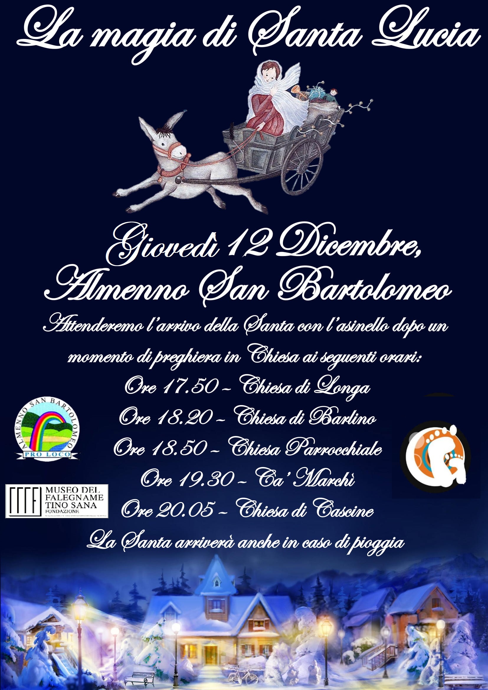 Quest’anno nella Chiesa Parrocchiale ci sarà la possibilità per tutti i bambini di lasciare la loro letterina alla Santa che penseremo noi a consegnare alla Chiesa di Santa Lucia a Bergamo. Ricordiamo ai bimbi di portarla prima del 12 dicembre di modo che la Santa faccia in tempo a recuperare i doni.