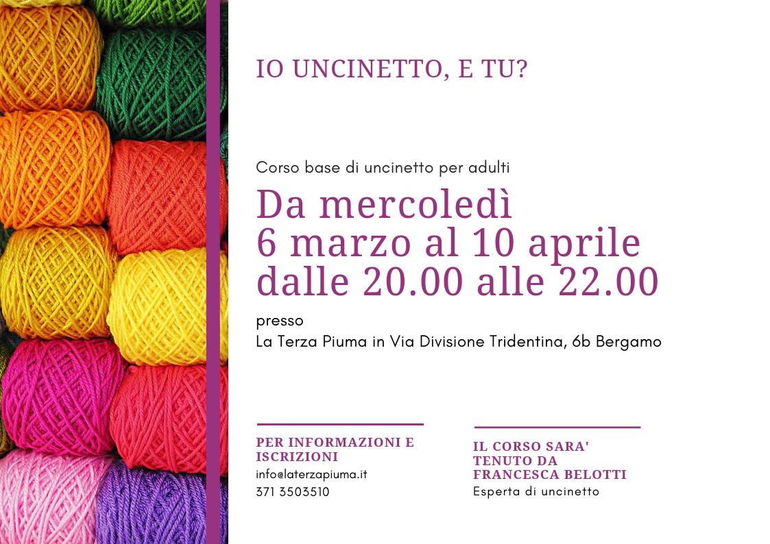 A partire da mercoledì 6 marzo, La Terza Piuma presenta un corso base di uncinetto per chiunque voglia imparare quest'arte.