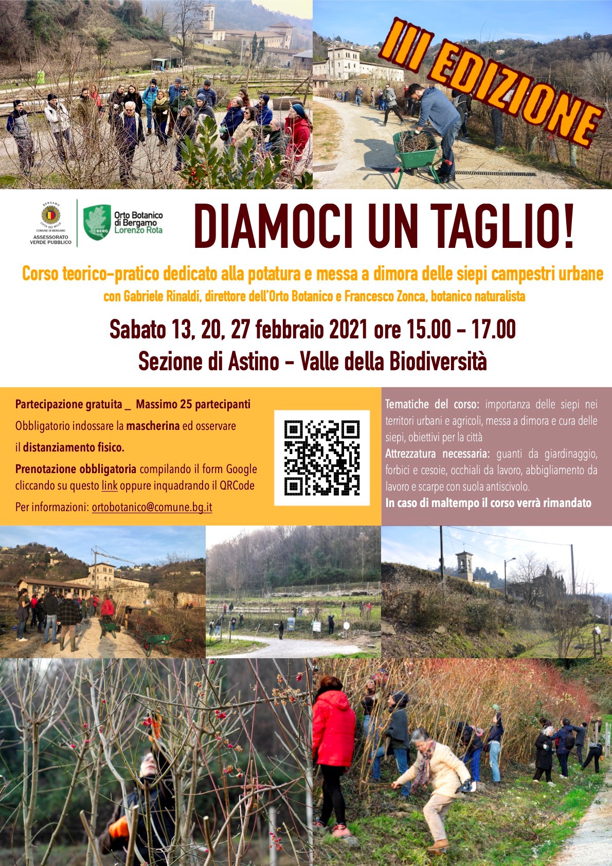 Per chi volesse invece cimentarsi con le attività in campo, fino alle 12 di venerdì 12 febbraio è possibile iscriversi a "Diamoci un taglio", corso in presenza di potatura e messa a dimora delle siepi campestri che si terrà presso la sezione di Astino-Valle della Biodiversità tutti i sabati di febbraio dalle 15 alle 17.