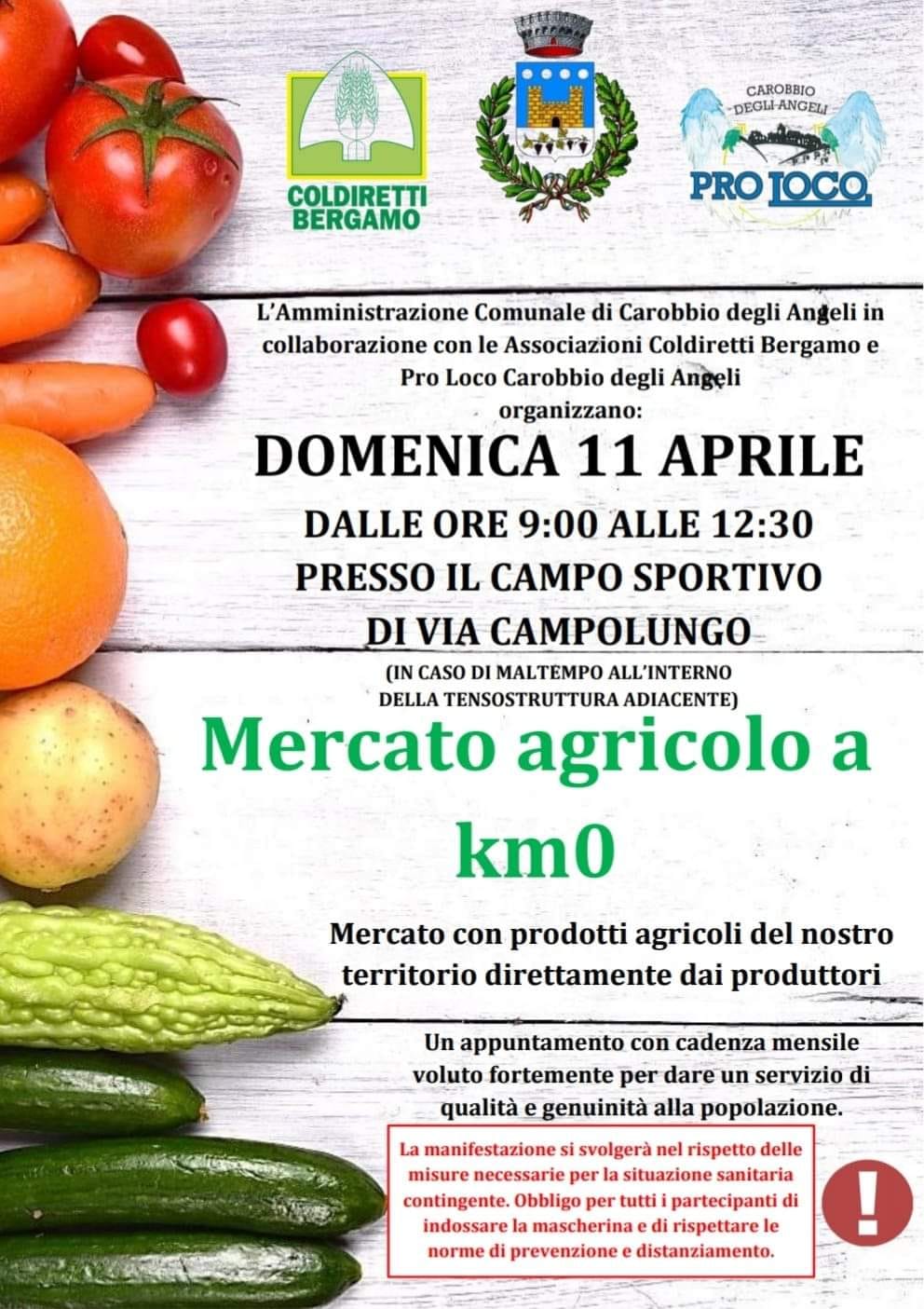 L'Amministrazione Comunale di Carobbio degli Angeli, in collaborazione con le associazioni Coldiretti di Bergamo e la Proloco di Carobbio, organizzano domenica 11 Aprile, presso il Campo Sportivo, il Mercato Agricolo a KM0 con tanti prodotti genuini e di altissima qualità.